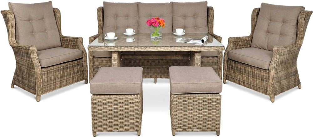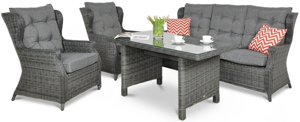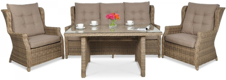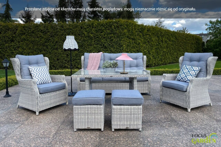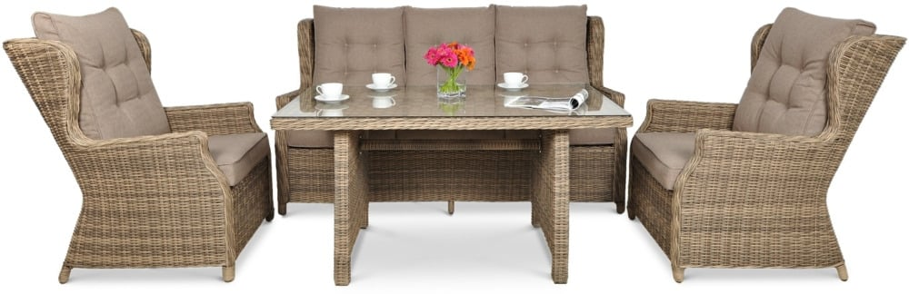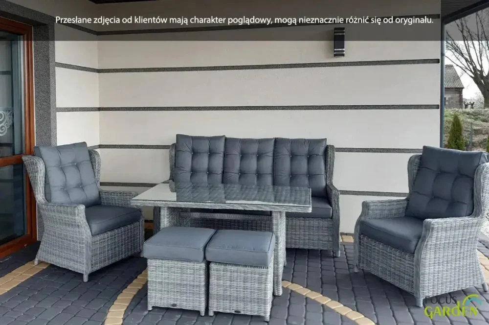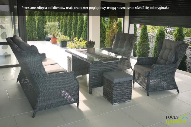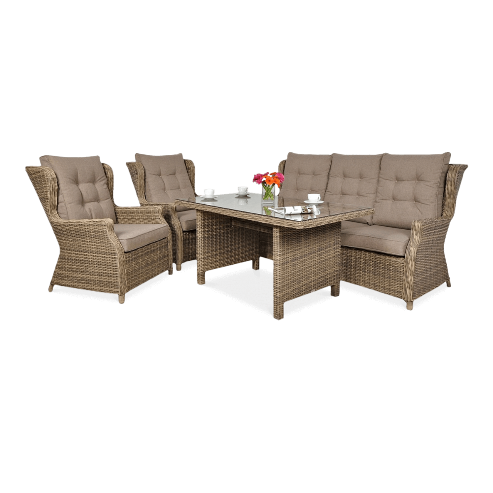 Комплект садових меблів TRIVENTO DINING 3 - ідеальні садові меблі з техноротанга з найвищими стандартами дизайну та виготовлення. Набір для відпочинку Trivento Dining 3 Brown ідеально підходить для використання на вулиці, але він також виглядає гідно та елегантно в приміщенні. В ексклюзивний набір входить 3-місний диван, 2 надзвичайно зручних крісла та великий широкий стіл. Меблі з техноротангу Trivento Dining 3 виглядають чудово на перший погляд - в житті вони виглядають ще краще, ніж на фото! Лаунж-набір Trivento Dining 3 Brown з техноратангу абсолютно нечутливий до сонячного світла та інших погодних факторів. Штучна і в той же час екологічно чиста коса на алюмінієвому каркасі виглядає як натуральна, але має набагато більш досконалі властивості. Садові меблі Trivento Dining 3 невибаглива у догляді, а первісна насиченість коричневого кольору техноротанга залишається незмінною. Забудьте про обтяжливе обслуговування кожні кілька місяців, насолоджуйтеся відпочинком і компанією своїх близьких! Ідеальним доповненням до лаунж-набору з техноратангу Trivento Dining 3 Brown є товсті м'які подушки - повний комплект для сидінь і спинок. Крім того, ви повинні оцінити незаперечні переваги особливої, зразково гладкої і рівної стільниці, яка накриває стіл. Загартоване скло має набагато вищу міцність і краще витримує дуже різні температури. Підсумовуючи: комплект меблів з техноратангу Trivento Dining 3 з лишком виправдає навіть найвищі очікування.