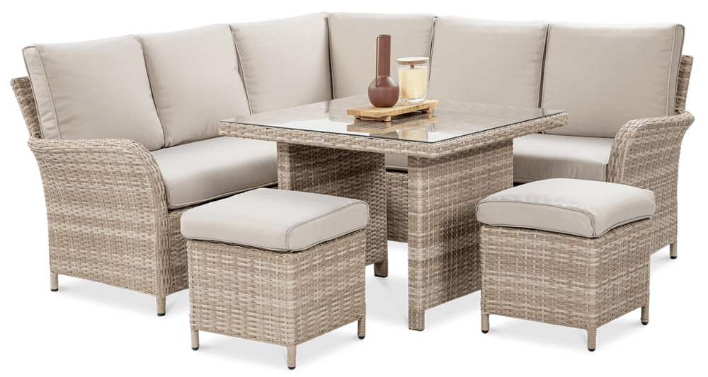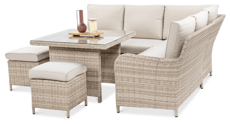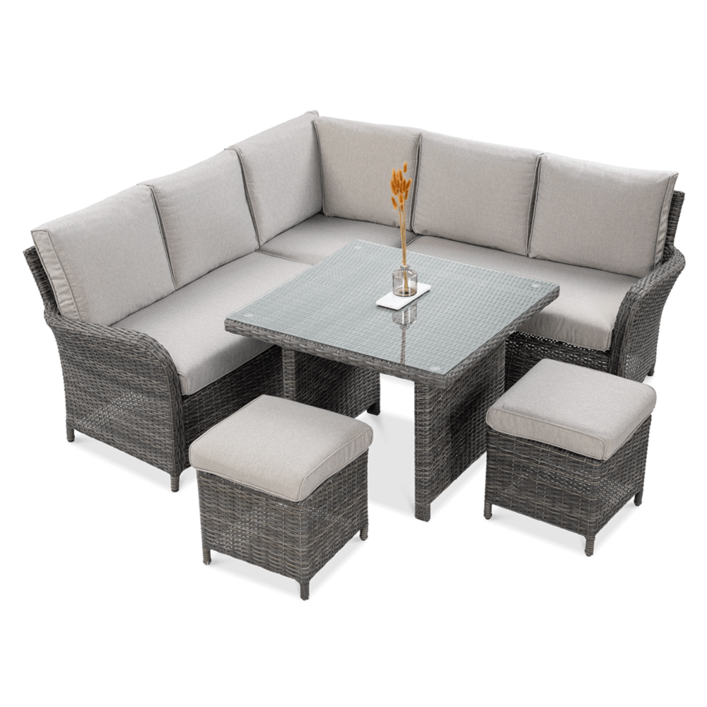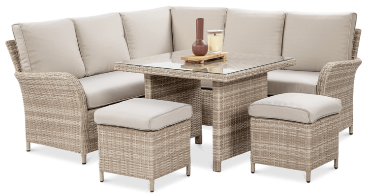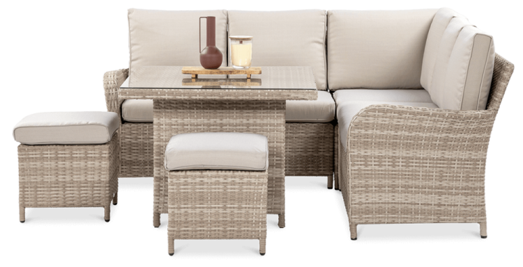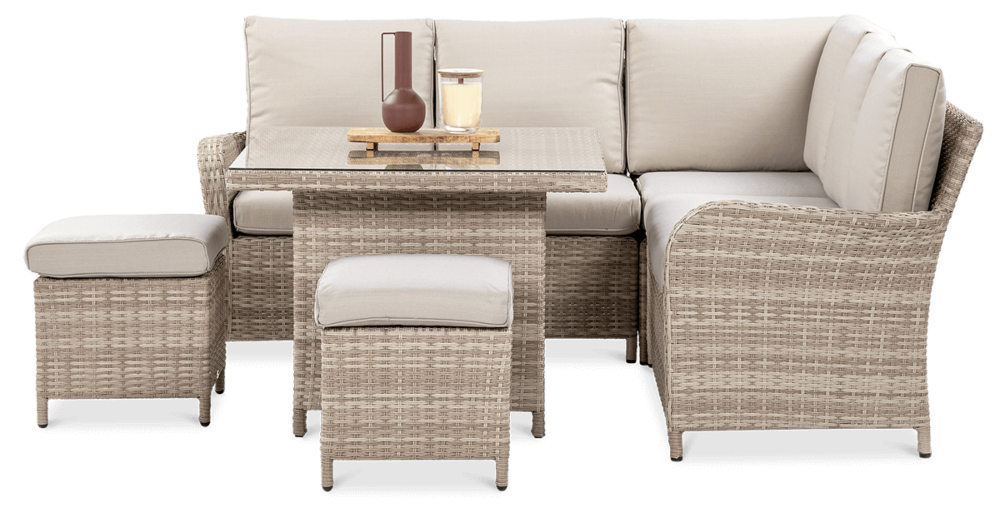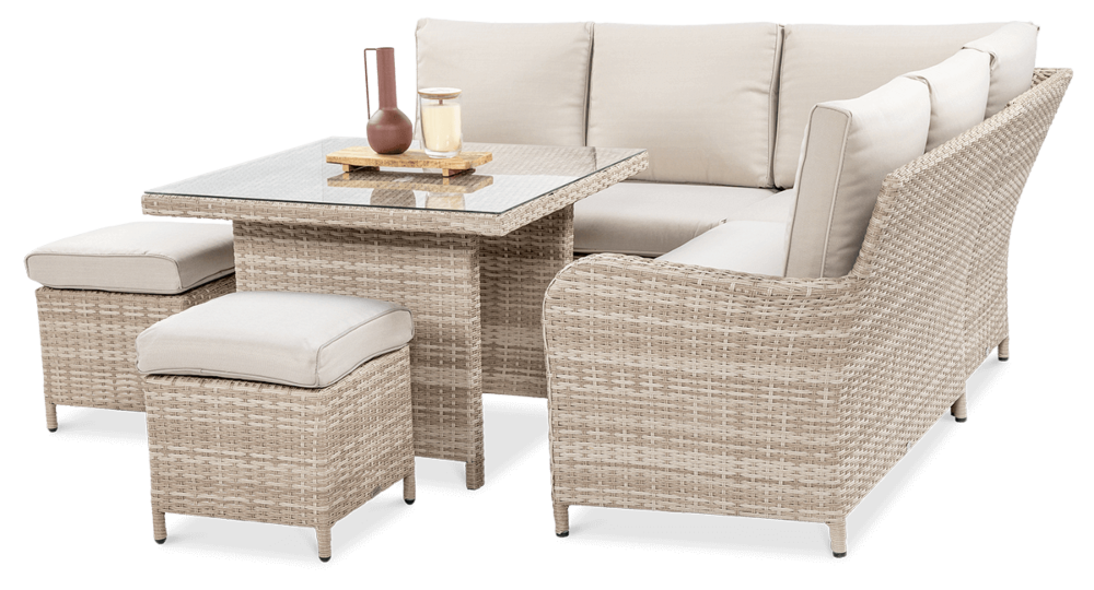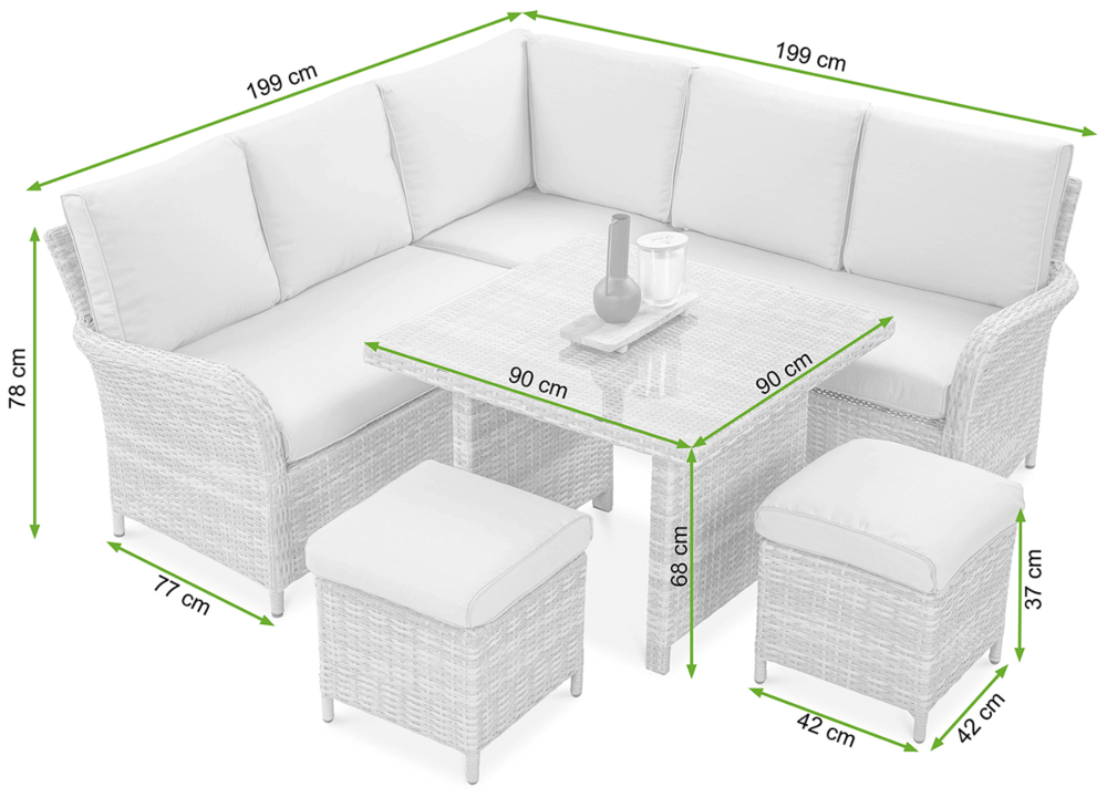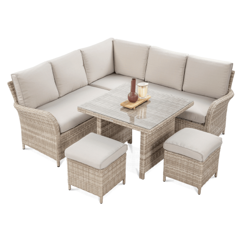 Комплект садових меблів VENTURA - ідеальний вибір для людей, які цінують естетику та функціональність. Набір виготовлений з високоякісного техноратангу, що робить його стійким до шкідливого впливу зовнішніх факторів і надзвичайно простим у догляді. Все це підтримується легкою та стійкою до корозії алюмінієвою конструкцією. Комплект складається зі столу зі стільницею, покритою загартованим склом, яке має високу стійкість до пошкоджень, кутового дивана з підлокітником і 2 пуфів. У комплект входять зручні та гнучкі подушки для спинки та сидіння, які підвищують комфорт у щоденному використанні. Чохли подушок мають блискавки, що дозволяє легко підтримувати їх у чистоті - просто зніміть їх і виперіть. Техноротанг і алюміній, використані для виготовлення набору, гарантують найвищу стійкість до шкідливих погодних умов - опадів, вологи, вітру, грибків, УФ-випромінювання. Меблі легко миються, стійкі, довговічні, не вицвітають, а їх поверхня не деформується. Їх можна використовувати як в приміщенні, так і на вулиці - вони надовго збережуть свій елегантний вигляд. Завдяки використовуваним матеріалам і нейтральним кольорам набір універсальний і впишеться в будь-яке оформлення. Завдяки своїм розмірам ідеально підходить для тераси або патіо.