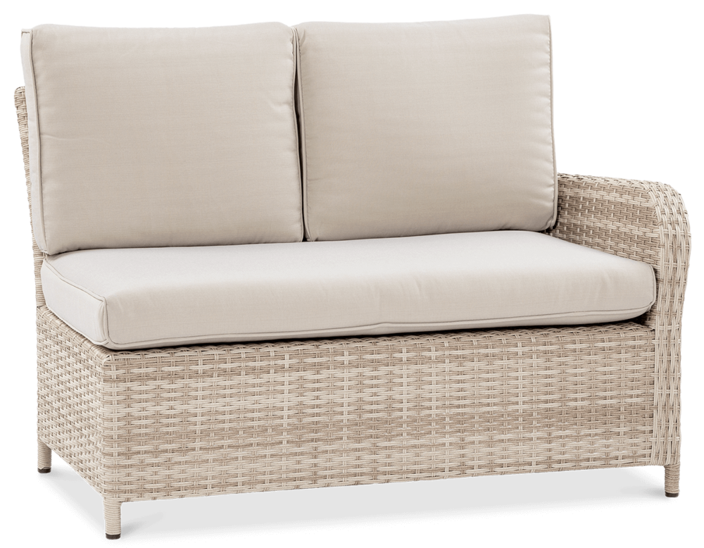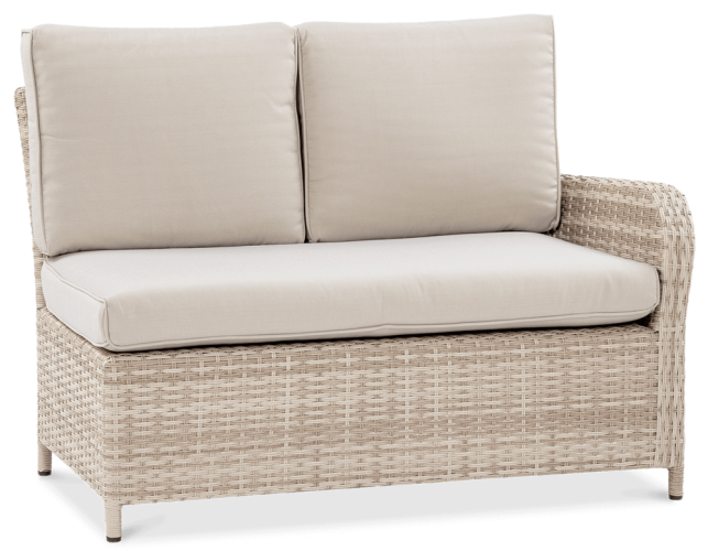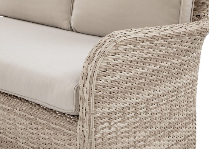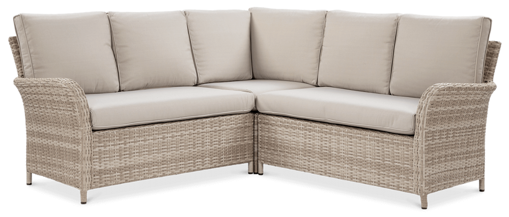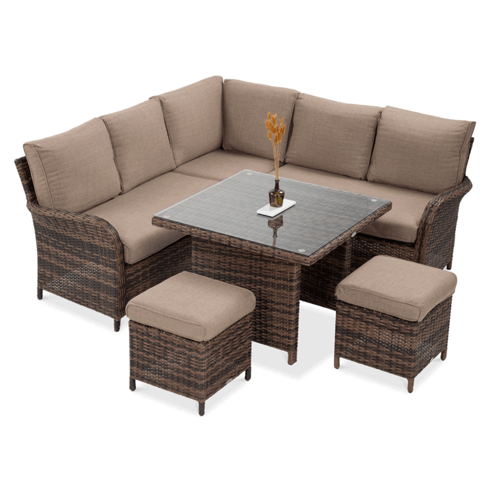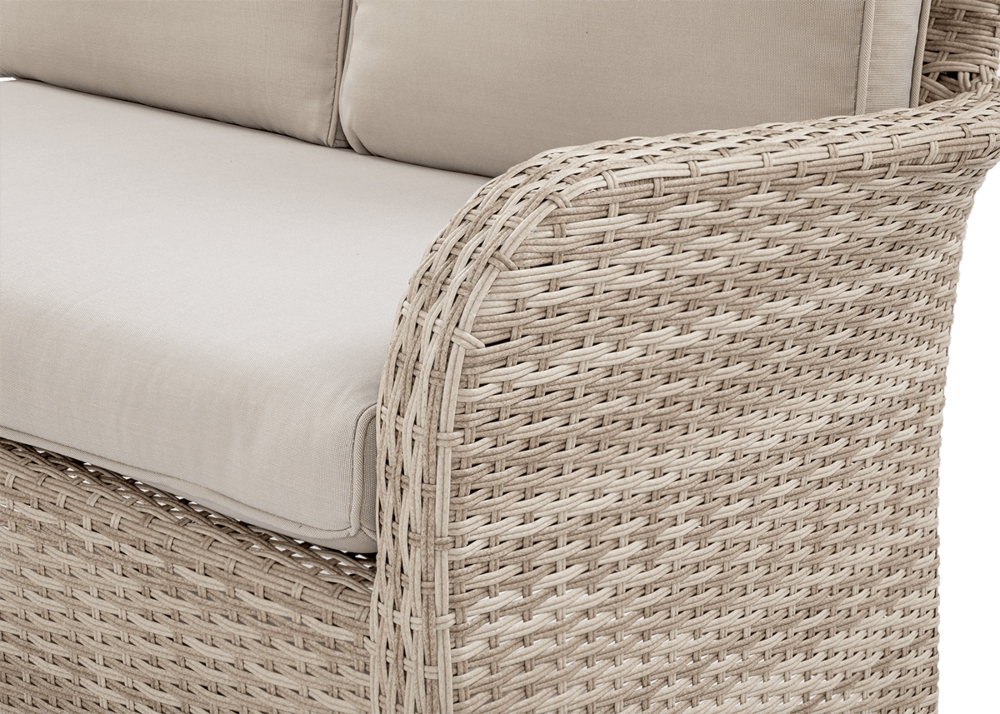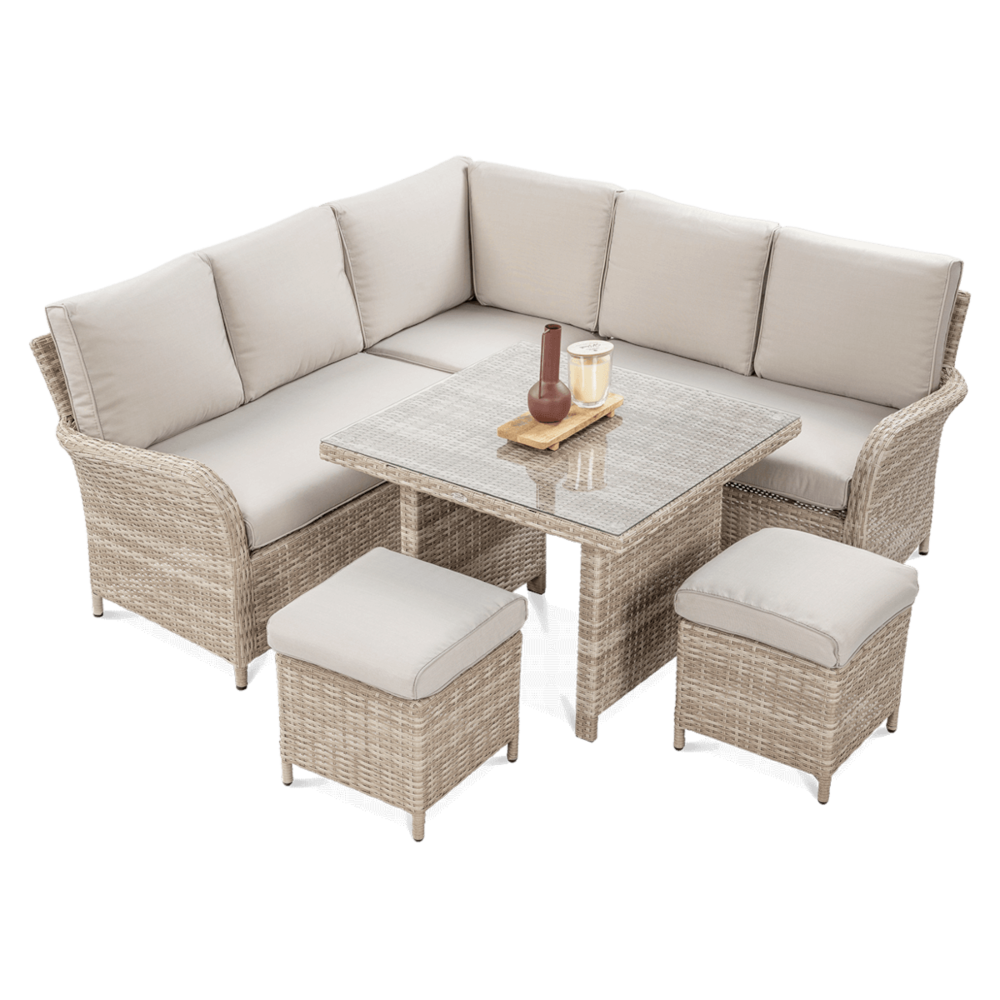 Комплект садових меблів VENTURA - ідеальний вибір для людей, які цінують естетику та функціональність. Набір виготовлений з високоякісного техноратангу, що робить його стійким до шкідливого впливу зовнішніх факторів і надзвичайно простим у догляді. Все це підтримується легкою та стійкою до корозії алюмінієвою конструкцією. Комплект складається зі столу зі стільницею, покритою загартованим склом, яке має високу стійкість до пошкоджень, кутового дивана з підлокітником і 2 пуфів. У комплект входять зручні та гнучкі подушки для спинки та сидіння, які підвищують комфорт у щоденному використанні. Чохли подушок мають блискавки, що дозволяє легко підтримувати їх у чистоті - просто зніміть їх і виперіть. Техноротанг і алюміній, використані для виготовлення набору, гарантують найвищу стійкість до шкідливих погодних умов - опадів, вологи, вітру, грибків, УФ-випромінювання. Меблі легко миються, стійкі, довговічні, не вицвітають, а їх поверхня не деформується. Їх можна використовувати як в приміщенні, так і на вулиці - вони надовго збережуть свій елегантний вигляд. Завдяки використовуваним матеріалам і нейтральним кольорам набір універсальний і впишеться в будь-яке оформлення. Завдяки своїм розмірам ідеально підходить для тераси або патіо.