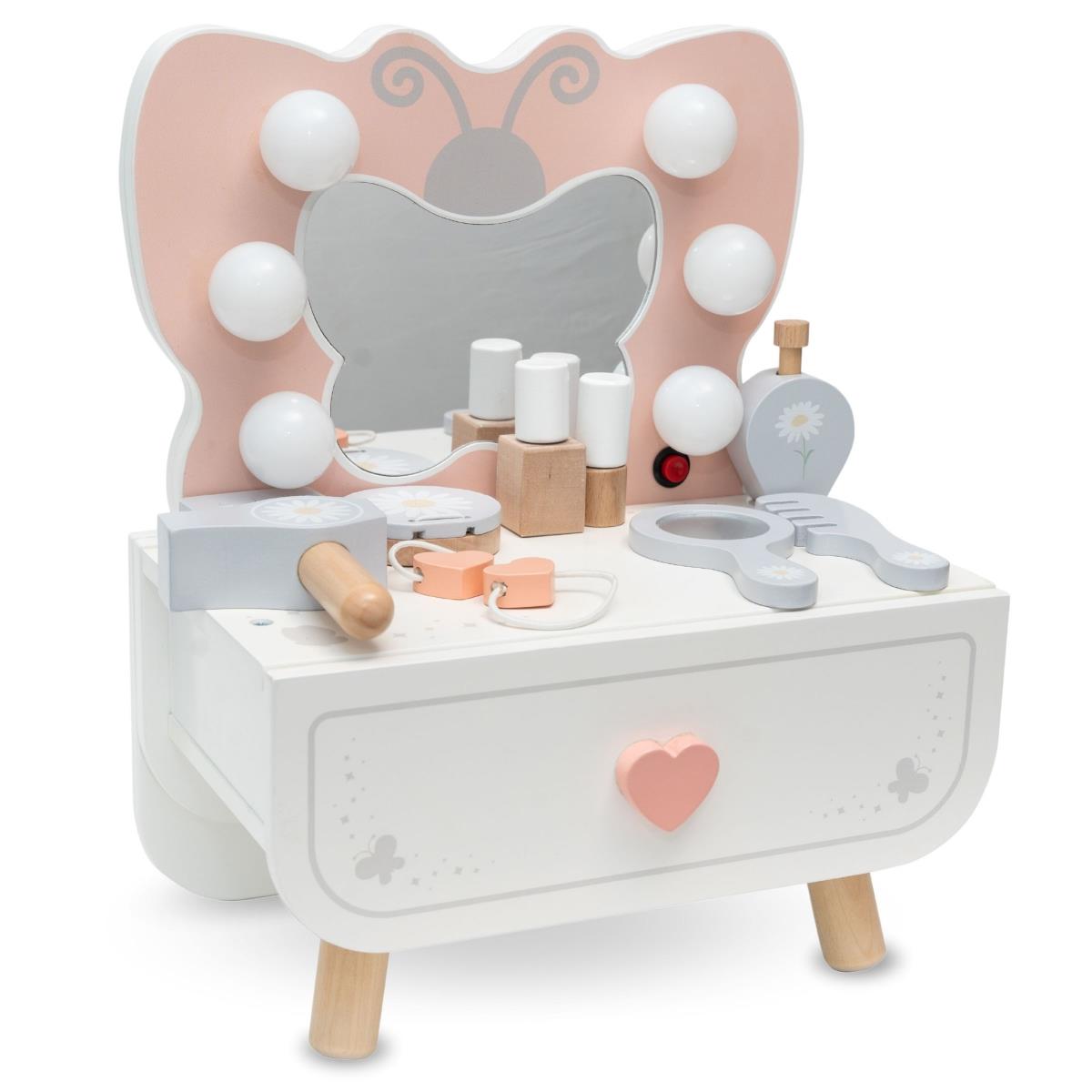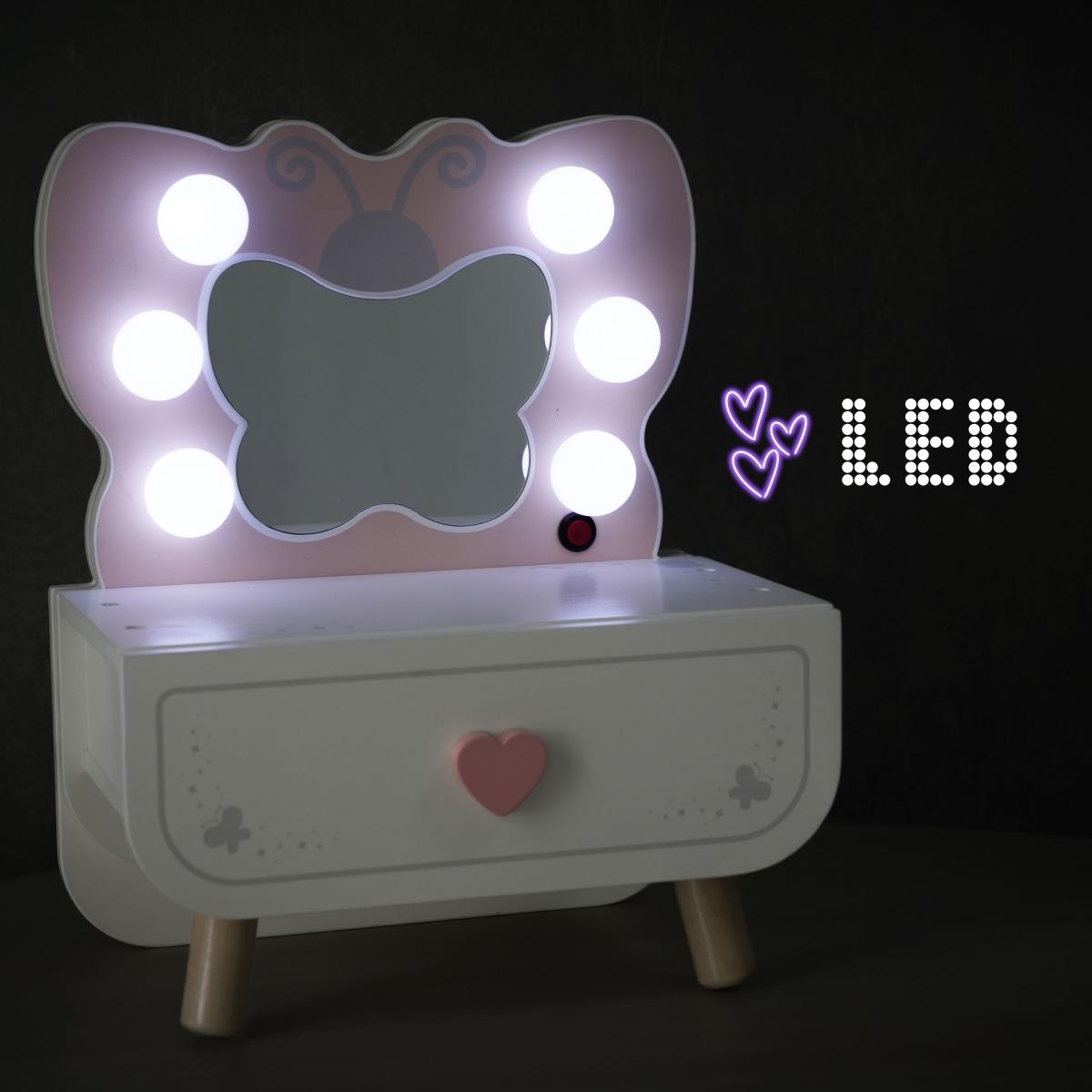 Дитячий туалетний столик Mamabrum Метелик - піклуватися про свою красу може бути дуже весело! Туалетний столик містить все, що потрібно кожній маленькій принцесі. Це фантастичний подарунок для вашої малечі!Дерев'яний міні-туалетний столик оснащений дзеркалом у формі метелика. 6 світлодіодних лампочок м'яко освітлюють обличчя вашої дитини, роблячи гру більш приємною. Містка шухляда легко вміщує всі аксесуари, такі як фен, парфуми, гребінець, дзеркало, пудреницю, резинки для волосся або лак для нігтів. Це легка і зручна для перенесення іграшка, яка забезпечить вашій дитині години творчих розваг.