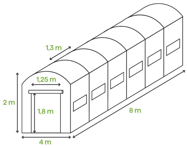 Садова теплиця-парник 32m2 Cultivo 4x8x2 - це фантастична і дешева пропозиція для всіх любителів вирощувати культури в саду і на присадибній ділянці. Завдяки максимальній функціональності, міцності та конкурентоспроможній ціні вони є відмінною альтернативою традиційним теплицям. Наші плівкові тунелі прискорять і підвищать урожайність, продовжать сезон і забезпечать відмінний мікроклімат і захист ваших культур.