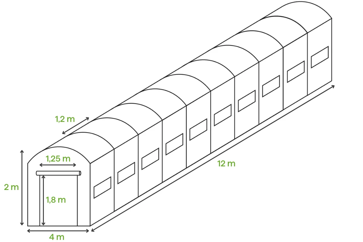 Садова теплиця-парник 48m2 Cultivo 4x12x2 - це фантастична і дешева пропозиція для всіх любителів вирощувати культури в саду і на присадибній ділянці. Завдяки максимальній функціональності, міцності та конкурентоспроможній ціні вони є відмінною альтернативою традиційним теплицям. Наші плівкові тунелі прискорять і підвищать урожайність, продовжать сезон і забезпечать відмінний мікроклімат і захист ваших культур.