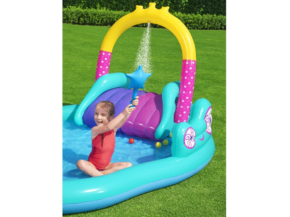 Бассейн Bestway Unicorn Slide 53097 - Бассейн изготовлен из мягкого, но прочного материала ПВХ насыщенных цветов. Плюс детской площадки - фонтанчик, подключенный к садовому шлангу, и двойная горка с посадочной площадкой. В набор также входят шары и прицельное кольцо в виде единорога.