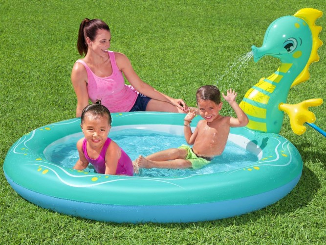 Бассейн Морской конек Bestway 188см 53114 - етский бассейн неглубокий, поэтому им могут пользоваться самые маленькие дети от 2 лет. После надувания бассейна лошадь достигает роста 188 см, также в ней есть встроенный ороситель. После подсоединения садового шланга вода будет брызгать изо рта! Бассейн, сделанный из мягкого, но прочного материала ПВХ, имеет размеры 188 см x 160 см x 86 см и вмещает 140 литров воды.