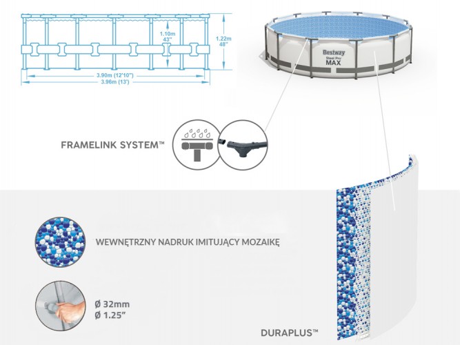 Каркасный бассейн Bestway 396x122cm 8w1 5618W - охладит вас в жаркий день. Благодаря частному бассейну в саду на заднем дворе вы можете в любое время окунуться в приятную воду или поплескаться. В нем можно нырнуть и сделать первые шаги в обучении плаванию.Каркас бассейна изготовлен из прочной стальной конструкции, устойчивой к коррозии и переменчивым погодным условиям. Использована FrameLink System ™ - то есть специально сформированные тройники предотвращают коррозию на стыке металл-металл, обеспечивают прочное и безопасное соединение рамы. Бассейн изготовлен из прочного трехслойного материала DuraPlus™, который представляет собой комбинацию сердцевины из полиэфирной сетки и двух толстых слоев ПВХ. Использованный материал гарантирует большую прочность и устойчивость к проколам, чем стандартный ПВХ. О чистоте воды позаботится насос мощностью 3028 л/ч, входящий в комплект. Металлическая лестница позволяет легко входить и выходить из бассейна. Дополнительная функция лесенки - подъем ступенек, не позволит детям пользоваться бассейном без присмотра взрослых.Благодаря покрытию, входящему в комплект, вы легко защитите бассейн от твердой грязи - кусочков травы, листьев или насекомых.Есть специальные клапаны для быстрого слива.
