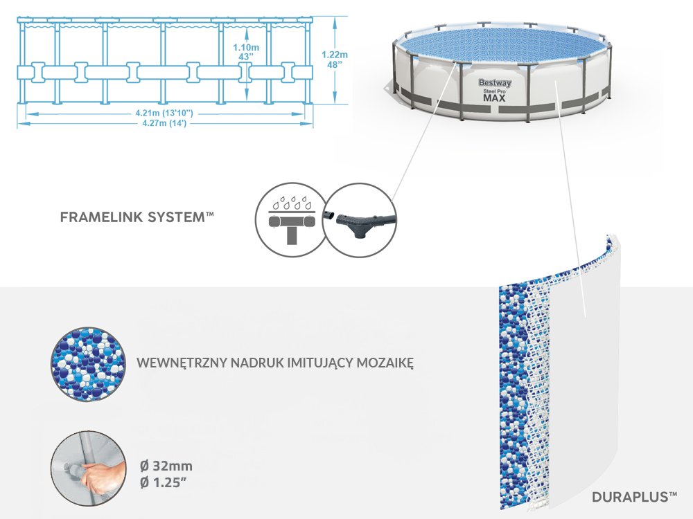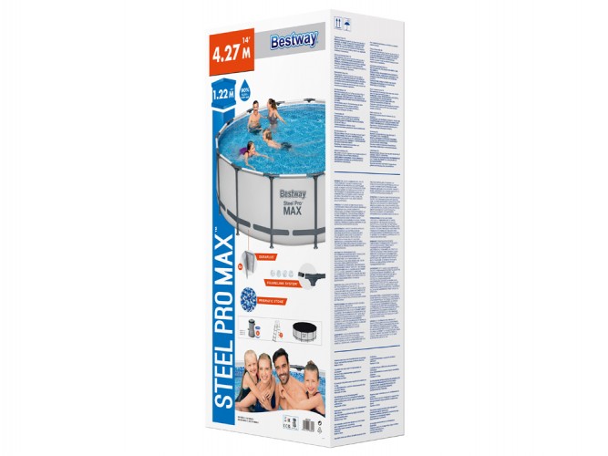 Каркасный бассейн Bestway 427x122cm 10w1 5612X - обеспечит вам блаженную прохладу в жаркий день. Сенсационный круглый бассейн внушительных размеров позволит отдохнуть и развлечься всей семье. Новинкой этого сезона является использование в бассейне ультрасовременного материала DURAPLUS - материала, усиленного сердцевиной из полиэфирной сетки и двумя толстыми слоями ПВХ, что обеспечивает отличную прочность и долговечность. Материал бассейна изготовлен в приглушенном сером оттенке ,так он выглядит эстетичнее и намного лучше чем традиционный синий. Металлический каркас Steel Pro MAX обеспечивает идеальную устойчивость конструкции . Рама изготовлена из материала, устойчивого к дождю и переменчивых погодных условий. Тройники системы FrameLink предотвращают коррозию на соединении металл-металл. Металлическая лестница позволяет легко входить и выходить из бассейна. Дополнительная функция лесенки - подъем ступенек, не позволит детям пользоваться бассейном без присмотра взрослых. В такой бассейн помещается 15 232 л воды, что дает много возможностей для развлечений, также вы сможете без проблем нырять в нем. Предоставлены специальные клапаны для быстрого слива. Чистота воды обеспечивается насосом, который фильтрует воду, чтобы можно было как можно дольше наслаждаться летним отдыхом в чистой воде. Благодаря покрытию, входящему в комплект, вы легко защитите бассейн от грязи - кусочков травы, листьев или насекомых.