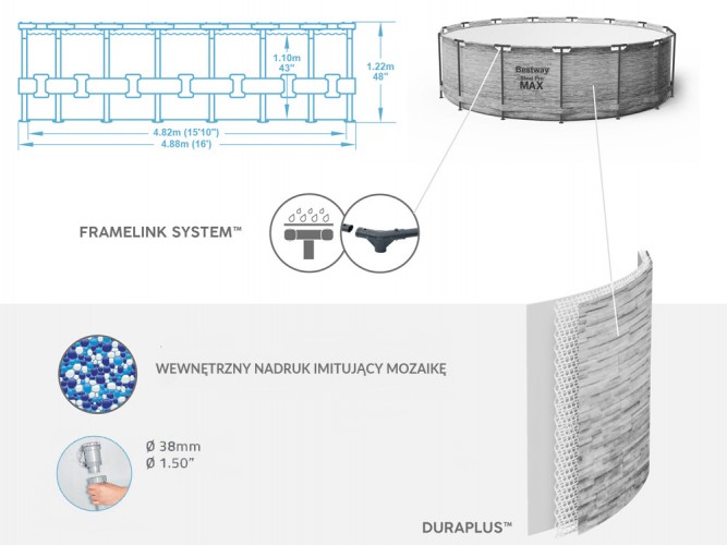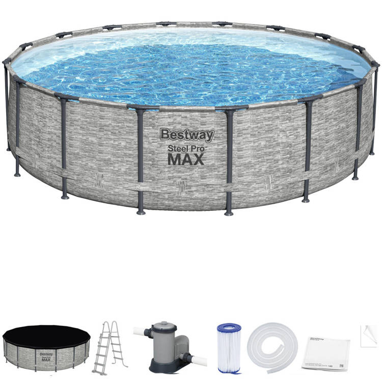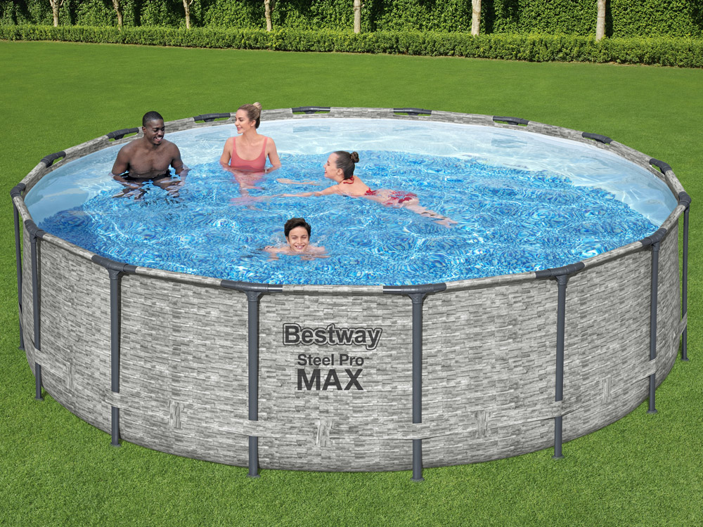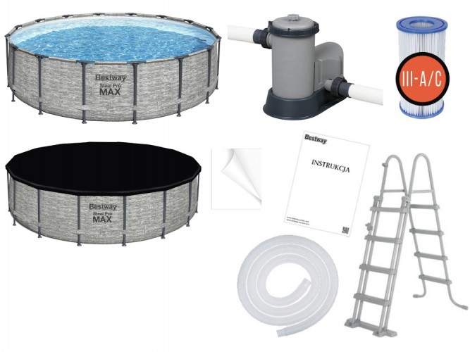 Каркасный бассейн Bestway 488x122 10w1 5619E - последнее предложение для летнего сезона. В этом огромном бассейне комфортно разместятся как дети, так и взрослые. Он идеально подойдет для времяпровождения с семьей или друзьями. В нем можно легко нырять или делать первые шаги в обучении плаванию. Благодаря Realistic Prismatic Stone™ - реалистичному рисунку каменной стены на бассейне, бассейн выглядит эстетично и элегантно и станет стильным дополнением садового пространства. Каркас бассейна Steel Pro Max™ изготовлен из стальной конструкции, устойчивой к дождю и переменчивым погодным условиям. Примененная система соединений FrameLink™ гарантирует прочное и долговечное соединение рамы, а также защищает от коррозии место соединения металл-металл. Бассейн изготовлен из прочного трехслойного материала DuraPlus™, он представляет собой комбинацию сердцевины из полиэфирной сетки и двух толстых слоев ПВХ. DuraPlus™ более устойчив к разрывам и проколам, чем стандартный ПВХ. О чистоте воды позаботится фильтрующий насос, входящий в комплект. Благодаря регулярному использованию насоса вы сможете беззаботно отдыхать в чистой воде. Металлическая лестница позволяет легко заходить и выходить из бассейна. Дополнительная функция лесенки - подъем ступенек, не позволит детям пользоваться бассейном без присмотра взрослых. Благодаря покрытию для бассейна вы можете легко защитить бассейн от твердых загрязнений, напр. листьев, кусочков травы или насекомых. Это также обеспечивает дополнительную защиту от падения ребенка в воду. Чехол изготовлен из прочного материала. Благодаря веревкам, позволяющим его крепить, ветер не оторвет его, а дренажные отверстия эффективно отведут избыток собирающейся воды.