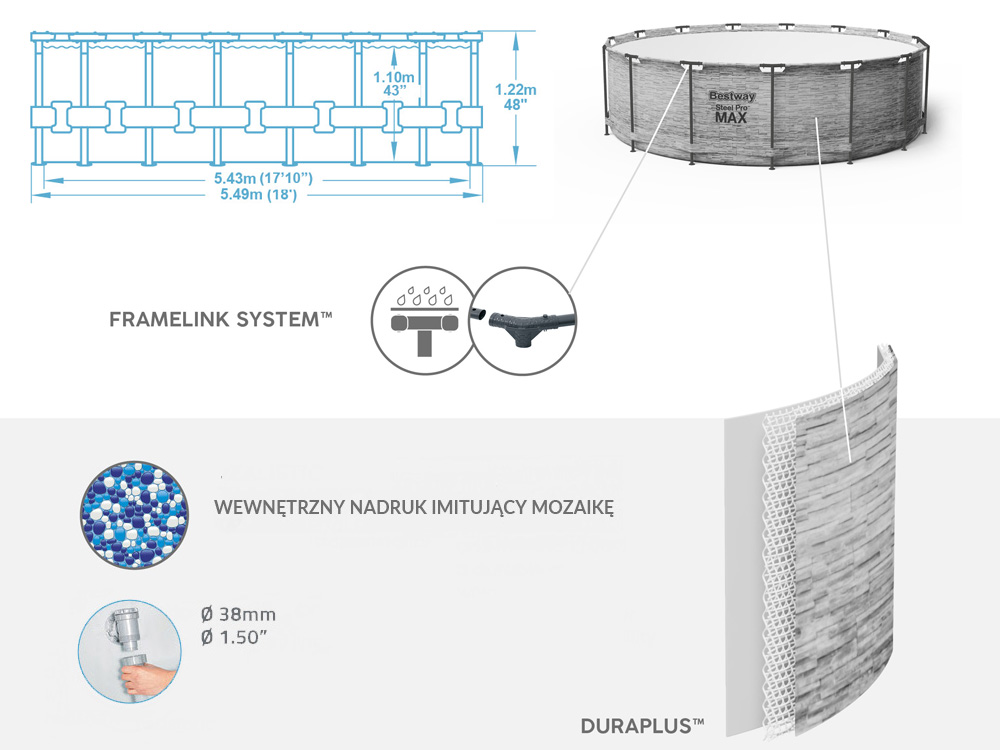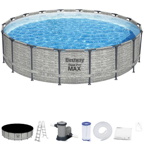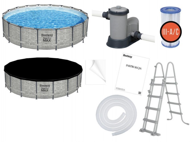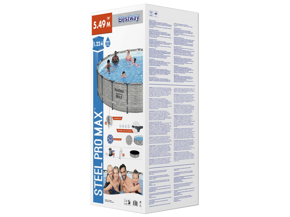 Каркасный бассейн Bestway 549x122cm 8w1 5618Y - охладит вас в жаркий день. Сенсационный круглый бассейн позволит отдохнуть и повеселиться всей семьей. В таком бассейне можно легко нырять или делать первые шаги в обучении плаванию. Madruk Realistic Prismatic Stone™, имитирующий каменную стену, не только выглядит эстетичнее, но и делает бассейн украшением приусадебного участка. Каркас бассейна изготовлен из устойчивого к коррозии стального каркаса, оснащенного системой FrameLink™, которая гарантирует прочное и безопасное соединение элементов. Бассейн изготовлен из прочного материала DuraPlus ™, который представляет собой комбинацию сердцевины из полиэфирной сетки и двух толстых слоев ПВХ. DuraPlus более устойчив к разрывам и растяжениям, чем стандартный ПВХ, что обеспечивает большую долговечность бассейна. 3-слойная лента обеспечивает дополнительную боковую поддержку. Фильтрующий насос с картриджем поможет вам дольше сохранить чистую воду, это незаменимое решение для улучшения качества воды в вашем бассейне. Безопасная лестница, входящая в комплект, облегчает вход и выход из бассейна. Состоит из четырех нескользких ступеней. Дополнительная функция лесенки - подъем ступенек, не позволит детям пользоваться бассейном без присмотра взрослых. Благодаря накрытию, входящему в комплект, вы легко защитите бассейн от грязи - кусочков травы, листьев или насекомых. Это еще и дополнительная защита от случайного попадания в бассейн детей. Накрытие является дополнительной теплоизоляцией воды в бассейне. Благодаря веревкам, обеспечивающим ее крепление, ветер не сорвет ее, а дренажные отверстия эффективно отведут избыток собирающейся воды.