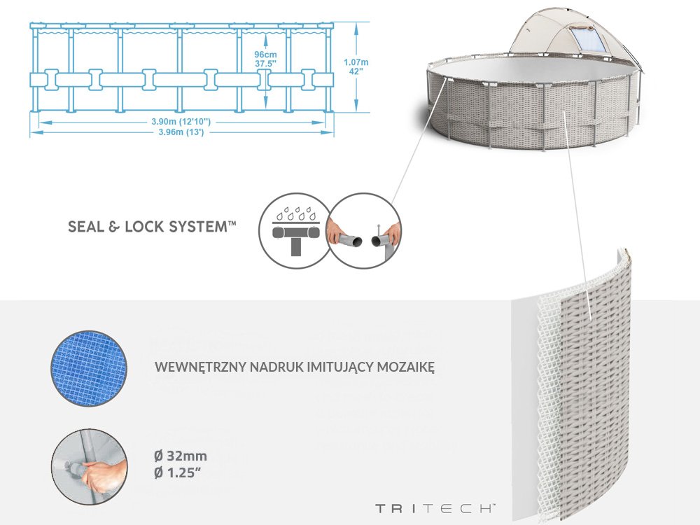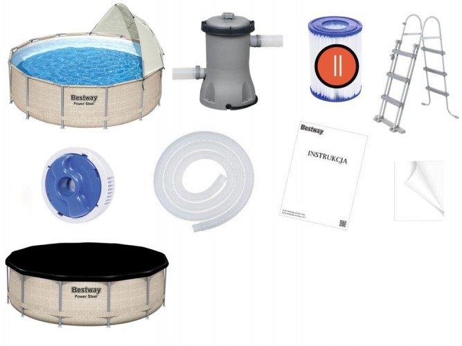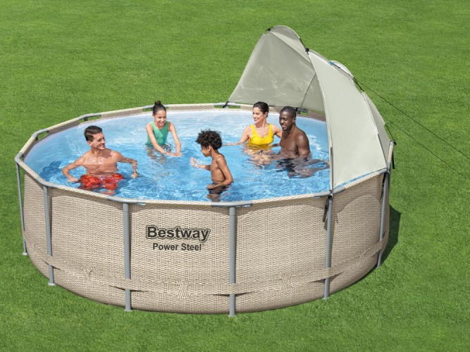 Каркасный бассейн Bestway с шатровым накрытием 396x107cm 5614V - обеспечит блаженное охлаждение в жаркий день. Сенсационный круглый бассейн внушительных размеров позволит отдохнуть и развлечься всей семье. Благодаря накрытию, входящему в комплект, бассейном могут пользоваться даже те люди, которые не любят или не могут принимать интенсивные солнечные ванны. Каркас бассейна Power Steel™ изготовлен из металла, устойчивого к дождю и переменчивым погодным условиям. Система Seal & Lock, которая используется в раме, обеспечивает безопасное и стабильное соединение элементов рамы и предотвращает коррозию на соединении металл-металл. Бассейн изготовлен из Tritech ™ - материала, сочетающего сердцевину из полиэфирной сетки и два толстых слоя ПВХ. Материал Tritech™ отличается повышенной прочностью и устойчивостью. Яркий ротанговый принт на внешней стороне бассейна повысит эстетичность отделки и сделает бассейн стильным дополнением садового пространства. Накрытие защитит вас от слишком интенсивного солнечного света. Благодаря ему можно спрятаться от лучей, не выходя из прохладной воды. Металлическая лестница позволяет легко входить и выходить из бассейна. Дополнительная функция лесенки - подъем ступенек, не позволит детям пользоваться бассейном без присмотра взрослых. Насос с фильтром, входящий в комплект, позаботится о чистоте воды. Дозатор ChemConnect™ поддерживает чистую, здоровую воду, поддерживая стабильный уровень хлора, который равномерно распределяется по бассейну. Благодаря покрытию, входящему в комплект, вы легко защитите бассейн от твердой грязи - кусочков травы, листьев или насекомых. В такой бассейн помещается 11 133 литров воды, что дает много возможностей для развлечений. Для легкого опорожнения есть встроенный сливной клапан с контролем потока.