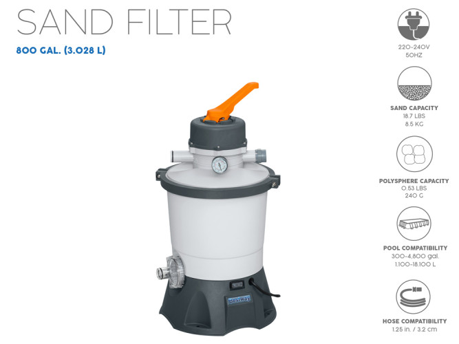Песочный насос для бассейнов Bestway 58515 - насос с производительностью 3028 литров в час поможет очистить бассейн от плавающей грязи и идеально подходит для бассейнов объемом от 1100 до 18 100 литров. -0,85 мм примерно 8,5 кг) или высокоэффективные фильтрующие шарики Polysphere™ весом примерно 240 г. Насос имеет прочный антикоррозионный бак. Верхний люк вращается на 360 градусов, что позволяет легко подключать шланги с любой стороны устройства, а 6-позиционный клапан позволяет легко управлять фильтром. Встроенный манометр позволяет легко измерять давление в баке, а входящий в комплект дозатор химикатов ChemConnect поддерживает и обеспечивает стабильный уровень хлора, необходимый для надлежащего химического баланса.Насос оснащен сетчатым фильтром для отделения листьев и другим грубым мусором.