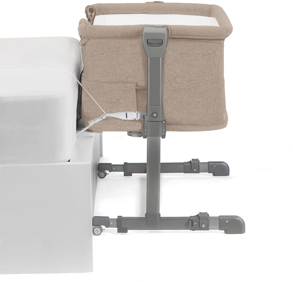 - Прочный, хорошо растянутый матрас в сочетании с сетчатыми стенками способствуют безопасности. Ребёнок не погружается в матрас, а сетка позволяет воздуху циркулировать, так что ребенок все еще имеет доступ к матрацу. Когда дно кроватки опущено, сетка закрывает всю стенку.