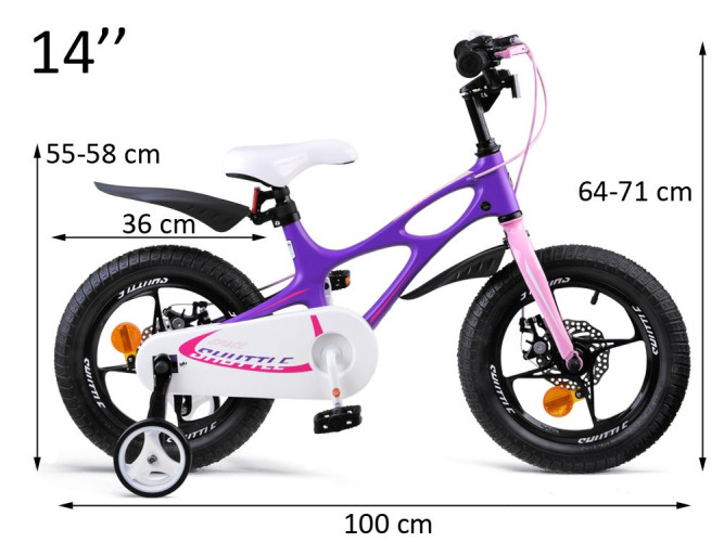 Детский велосипед RoyalBaby Space Shuttle 14'' RB14-22 - это первоклассный велосипед для любителей двухколесного транспорта, который идеально подходит для настоящих велосипедистов-любителей. Легкая магниевая рама с изогнутой поверхностью и плавными линиями, регулируемый руль профессиональной формы с безопасными резиновыми ручками, с закрытой крышкой регулировки, колокольчиком и световозвращателем. Удобное седло, 14-дюймовые колеса с высококачественными шинами, двойная безопасная тормозная система с двойными дисковыми тормозами обеспечат комфортную и стабильную езду. Боковые колеса + крепящийся руль для обеспечения равновесия на начальном этапе, чтобы ваш ребенок быстрее научился ездить самостоятельно. Полная защита цепи для защиты от травм и грязи. Высококачественные компоненты, не вызывающие проблемы в использовании. Цвета и графика, которые нравятся владельцу и другим велосипедистам. Этот велосипед великолепно изыскан, расстояния между рулем, седлом и педалями пропорционально выдержаны для плавной и комфортной езды.