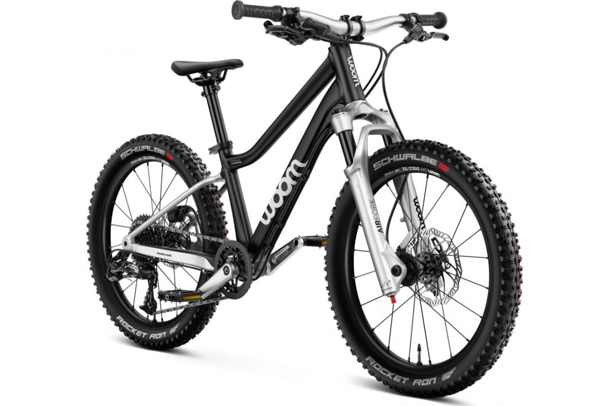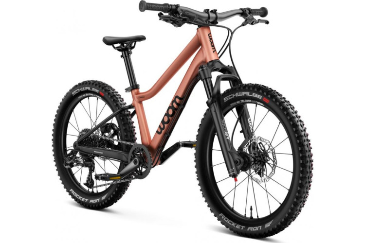 - Колеса Woom имеют алюминиевые ободья, машинные подшипники и оснащены огромными шинами Schwalbe Rocket Ron 2.25, обеспечивающими отличную амортизацию для этого легкого хардтейла на пересеченной местности. Шины Rocekt Ron имеют низкое сопротивление качению и являются классикой, когда речь идет о быстрых внедорожных велосипедах :) Колеса закреплены на оси, поэтому вам понадобится гаечный ключ, чтобы снять колесо (они не имеют быстрого снятия). Переднее установлено на ось 15x100, а заднее – на 12x135.