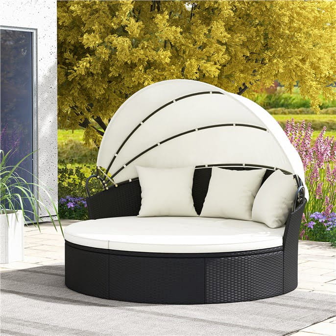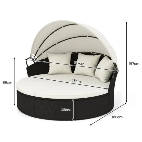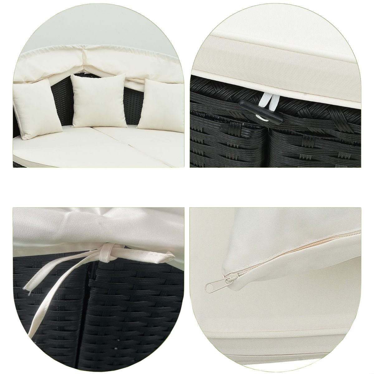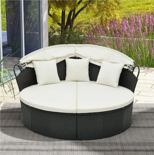 - весь круглый шезлонг изготовлен из высококачественного черного полиэтиленового ротанга, который тщательно выткан, устойчив к выцветанию и очень прочен. Кроме того, крепкая металлическая рама с регулируемыми подножками обеспечивает высокую устойчивость и прочную поддержку мебели.