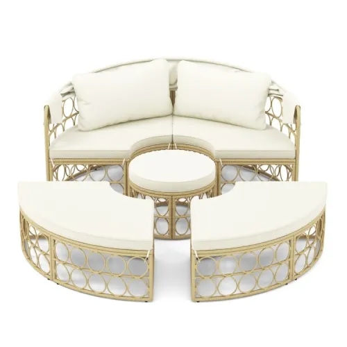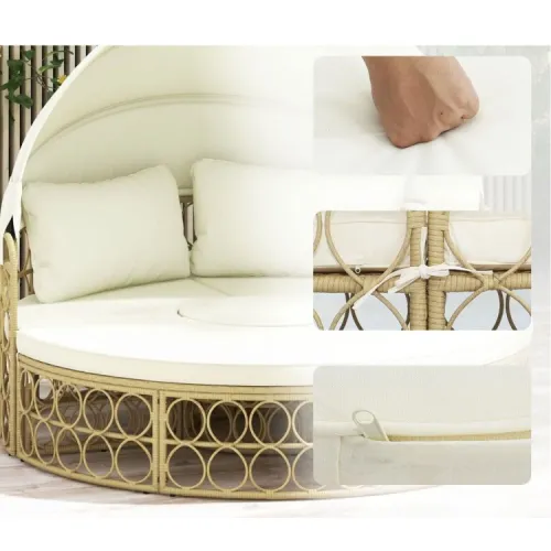 - Открытый диван оснащен выдвижным тентом с системой легкого газового подъема, что позволяет свободно выбирать между солнцем и тенью, обеспечивая комфортный отдых в течение всего дня.