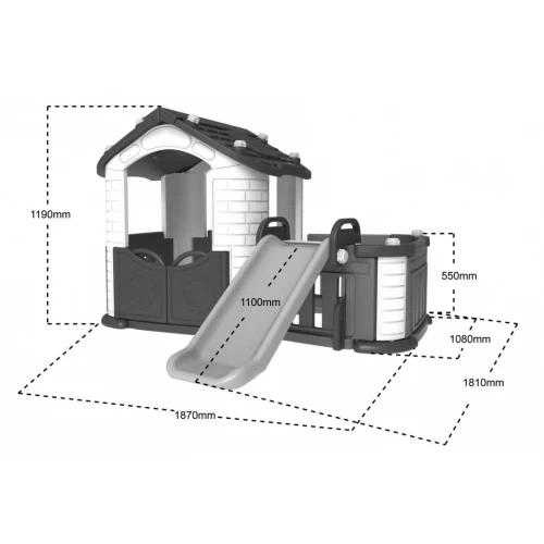 Детский садовый домик 3в1 Ramiz с горкой - идеальное место для игр и отдыха на свежем воздухе. Оснащенный горкой и садом с ограждением, он предоставляет множество возможностей для творческих игр и физической активности. Это также идеальный выбор для родителей, которые хотят подарить своим малышам незабываемые каникулы, не покидая собственного сада. Домик с горкой и детским садом изготовлен из высококачественного материала HDPE, который имеет высокую плотность примерно 0,942-0,965 г/см3. Этот материал более гибок и устойчив к механическим повреждениям, чем материалы, используемые в конструкциях других производителей. Все элементы изготовлены из двойного слоя пластика, что позволяет заполнять их, например, песком, для дополнительной стабильности конструкции. Благодаря большим строительным элементам, сборка бунгало не составляет труда и позволяет быстрее начать развлечения. Благодаря использованию высококачественных материалов, детский садовый домик не только безопасен, но и прочен и устойчив к повреждениям, что гарантирует долгие годы веселья. Большое пространство внутри коттеджа обеспечивает достаточную свободу передвижения во время игры. Большая дверь, открывающаяся заподлицо с поверхностью, не создает никаких проблем при входе и выходе из коттеджа, а встроенный тамбур с проходом добавляет шарма. Конструкция позволяет легко убрать забор вокруг сада и добавить стену, чтобы сделать его более индивидуальным. Эта модель имеет безопасную 2-слойную горку для комфортного и быстрого съезда. Внутри огражденного сада есть широкие и устойчивые ступени, ведущие к горке для легкого и комфортного использования. С таким оборудованием дети могут играть на свежем воздухе и развивать свою моторику.