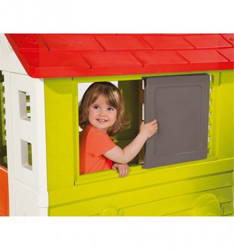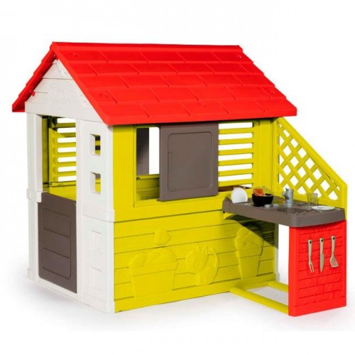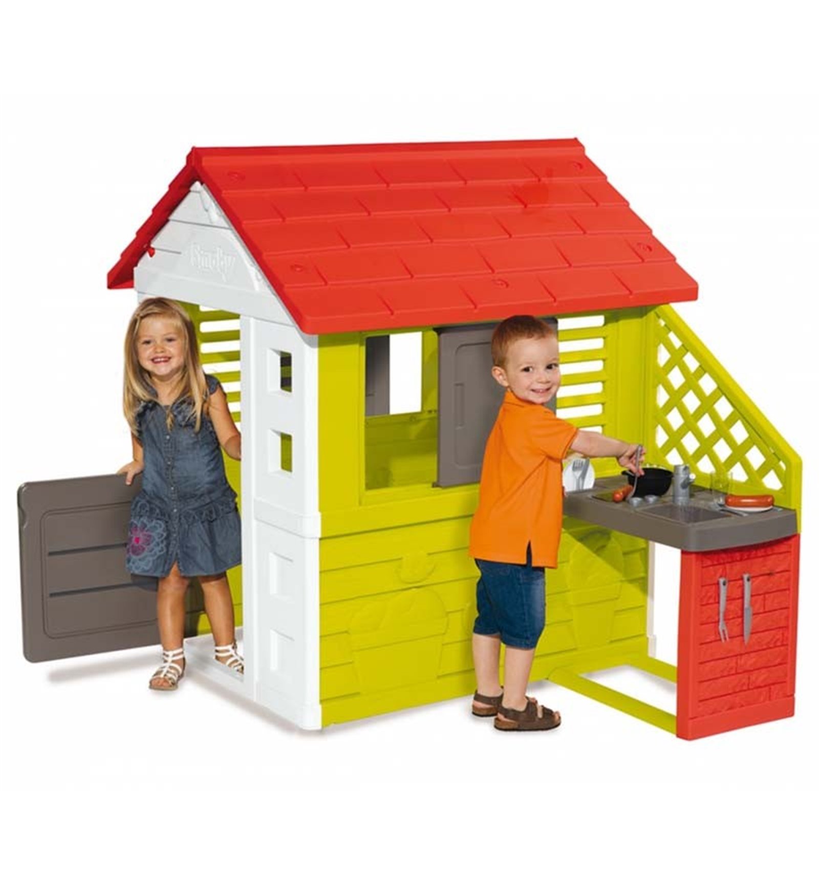 Игровой Домик Nature с кухней Smoby - Яркий дом, оснащенный кухней и набором аксессуаров для увлекательной игры на свежем воздухе, станет любимой игрушкой для вашего ребенка. В домике есть низкая дверка и окна с раздвижными ставнями и жалюзями. Кухня и аксессуары позволят детям разнообразить игры и приготовить обед для друзей.Дом изготовлен из высококачественного, устойчивого к ультрафиолету пластика. Дом устойчив к атмосферным воздействиям и выгоранию цвета.На игровой кухне, которая крепится к внешней стене, есть раковина с краном (без подачи воды), плита для приготовления пищи и подставка для посуды.Приготовление пищи дополняется колбаскам, стаканам, тарелкам, столовым приборам,.Подходит для детей от 2 лет.
