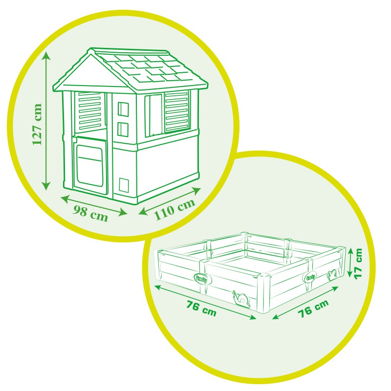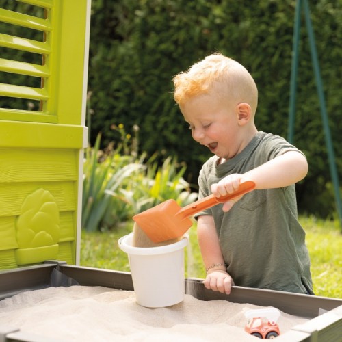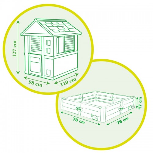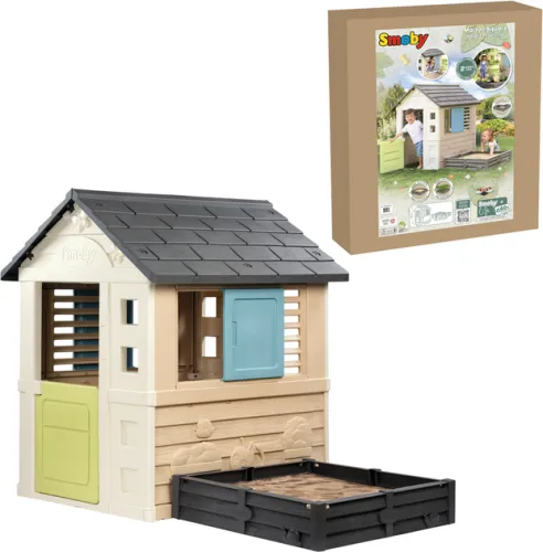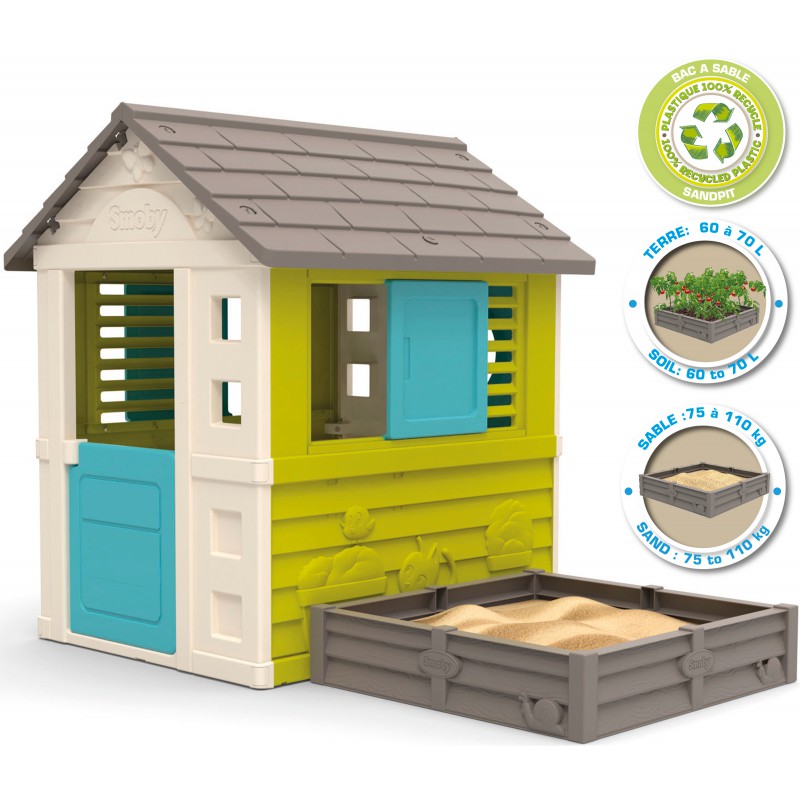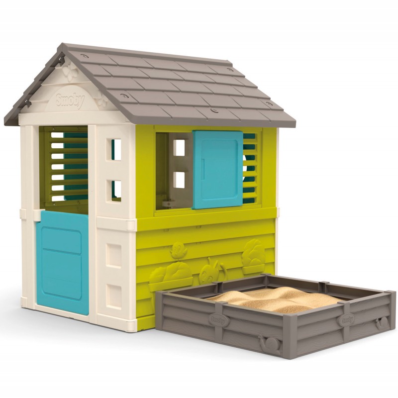 Игровой Домик с песочницей Smoby - в этой уютной зеленой избушке с отдельно стоящей песочницей, ваши дети смогут проводить почти весь день, играя со своими друзьями. Рядом с избушкой есть песочница, которую также можно использовать как огород. Ее можно прикрепить к домику или разместить в любом другом месте. Для защиты земли под песочницей в комплекте есть брезент. Песочница вмещает до 100 кг песка или 70 кг земли.