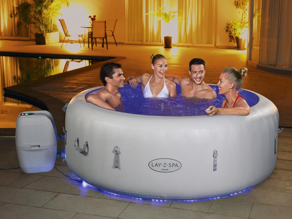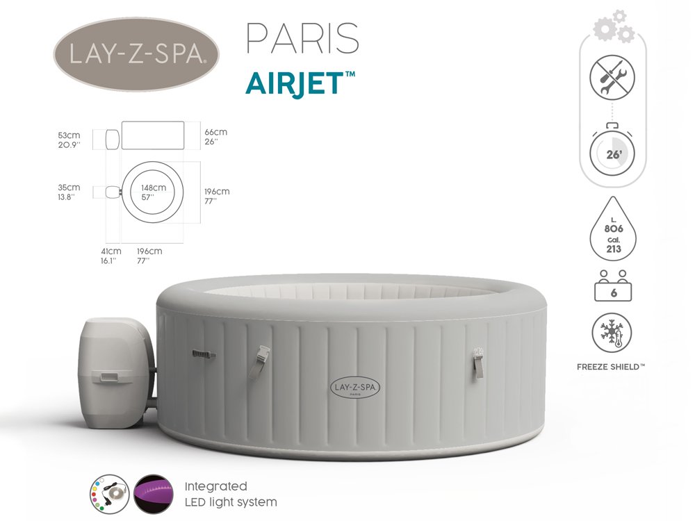 Джакузи Bestway Lay-Z-Spa PARIS 60013 - рассчитанный на 4-6 человек, подойдет для блаженного отдыха после тяжелого дня, для застолья с друзьями, игр с детьми. Джакузи размером 196 x 66 см с легкостью разместит всех, кто ищет отдыха, массажа и релаксации. Достаточно поставить насосный бассейн на устойчивое место, включить насосную систему, налить воду и наслаждаться отдыхом. Система AirJet включает 140 форсунок, которые выпускают пузырьки из нижней части джакузи, создавая теплую, бурлящую атмосферу спа с гидромассажем. Насос включает систему быстрого нагрева (1,5–2,0 ° C / ч), которая нагревает воду до макс. 40 ° C. Таймер энергосбережения не только экономит энергию, «выключая» Lay-Z-Spa Paris, когда он не используется, но также позволяет вам запланировать, когда ваша ванна должна нагреться, чтобы она была готова к работе заранее. мы возвращаемся домой.