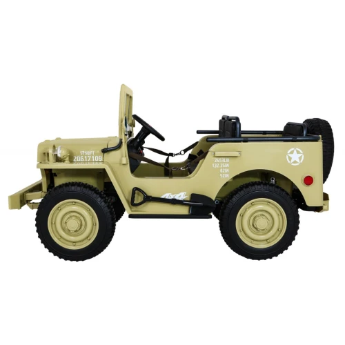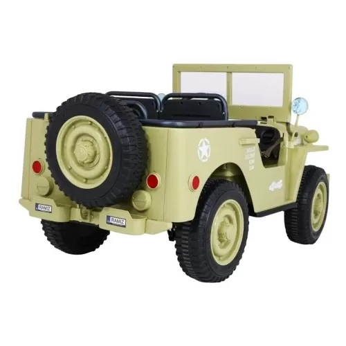 Детский электромобиль Ramiz Retro Strong 24V 3-местный – внедорожник со сменным приводом 4х4 или 2х2 использует всю мощность автомобиля, необходимую для бесперебойной работы в любых условиях. Ваш ребенок может безопасно ездить по пересеченной местности, а на ровной поверхности переключается на экономичный режим 2х2. Целых 4 мощных двигателя по 45 Вт каждый обеспечивают плавный и мягкий ход. Они работают от аккумулятора 12В/14Ач. Все водители любят слушать и петь любимые песни во время движения. Именно поэтому электромобили оснащены аудиопанелью – чтобы сделать каждую поездку приятной. Ваше музыкальное устройство можно подключить через USB, MP3, мини-джек и Bluetooth. Кроме того, доступны звуки на руле, например, клаксон. Малыши также будут в восторге от светодиодных фонарей спереди. Военный автомобиль для детей позволяет взять с собой до 3 человек для поездки. Спереди расположено широкое 2-местное сиденье, а сзади – дополнительное большое сиденье. Положение сиденья можно регулировать в 2 ступени для более комфортной езды. Небольшие отсеки для хранения напитков и закусок по бокам пригодятся при преодолении увлекательных маршрутов. Автомобиль в военном стиле оснащен ремнями безопасности на каждом сидении. При трогании и торможении срабатывает механизм Slow Start. Кроме того, в машине есть пульт дистанционного управления, чтобы родители могли управлять автомобилем на расстоянии и немедленно остановить его в экстренной ситуации. Качество изготовления автомобиля находится на самом высоком уровне и дарит комфорт во время движения. Все сиденья изготовлены из удобной вентилируемой экокожи, а колеса – из прочной пены EVA. Кроме того, каждое колесо усилено амортизатором. При необходимости в машине можно сложить ветровое стекло.