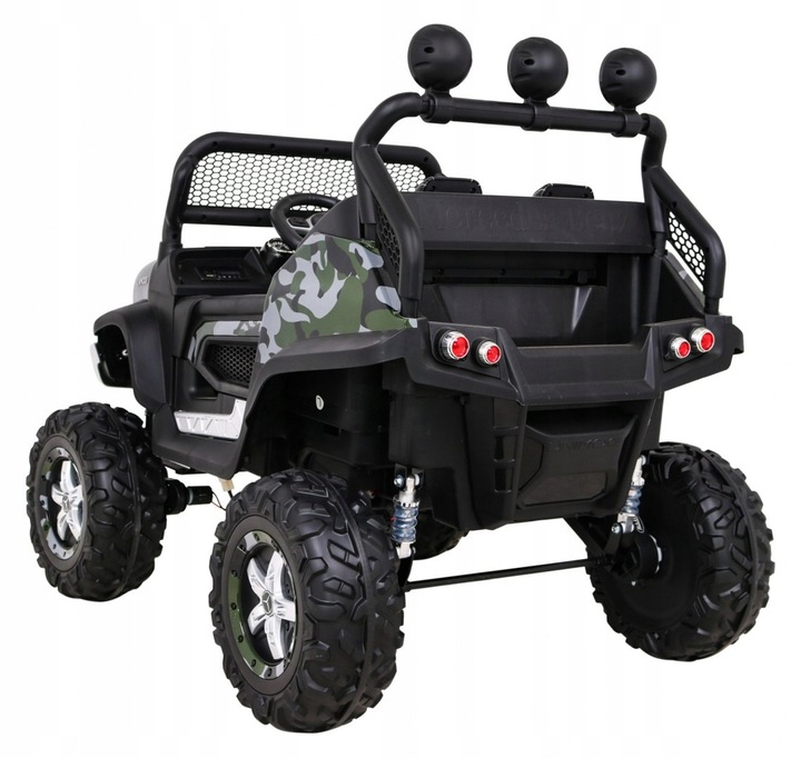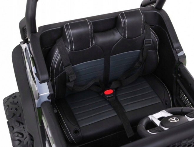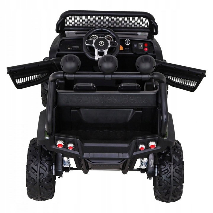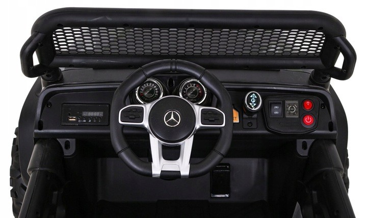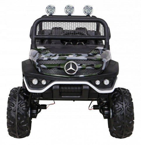 Электромобиль RAMIZ Mercedes BENZ UNIMOG 12V/10Ah - это лицензированная, хорошо укомплектованная, практичная и безопасная внедорожная модель для детей. Сделайте ребенку классный сюрприз. Транспортное средство привлечет внимание любителя маленьких и больших автомобилей. Лицензия Mercedes гарантирует высокое качество и тираж. Автомобиль идеально подходит для езды по неровной местности, потому что имеет большие колеса из мягкой пены EVA. Амортизаторы имеют регулируемую подвеску и удобное сиденье из экокожи для комфорта езды вашего ребенка. Он приводится в движение мощностью четырех мощных двигателей по 35 Вт каждый. Имеет мощные батареи 12V/10Ah. Автомобиль изготовлен из прочного пластика, оснащен светодиодными фонарями спереди и сзади автомобиля. Модель отвечает всем требованиям безопасности, имеет ремни, замок боковой двери и пульт дистанционного управления, благодаря которому отец будет иметь полный контроль над автомобилем. Пульт дистанционного управления позволяет управлять машиной вперед, назад, поворачивать, корректировать езду ребенка и при необходимости немедленно останавливаться. Бесспорным преимуществом автомобиля является медленный СТАРТ, автомобиль начинает движение очень медленно, чтобы ваш ребенок не испугался во время движения. Автомобиль будет использоваться ребенком, пока он не достигнет 30 кг веса.