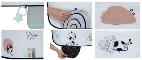 - Чутье – черно-белый дизайн и четкие иллюстрации, бряцающие и шелестящие элементы, а также разнообразные текстуры стимулируют чувства ребенка.