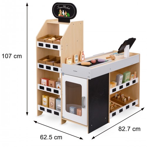 Большой киоск Mamabrum XXL с кассовым аппаратом - многочисленные стеллажи для выкладки товаров позволяют маленькому продавцу рассортировать товары и удобно их разложить. Благодаря устойчивой подставке и богатому оснащению деревянного киоска, ребенок может выступать в роли продавца или покупателя и наслаждаться уникальными творческими развлечениями.