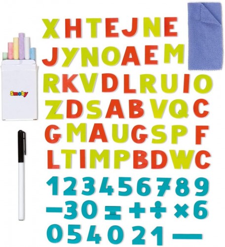 Включает 80 аксессуаров: стираемая маркерная ручка, 6 цветных мелков, 72 магнитных буквы и цифры и ластик.