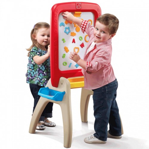 Двухсторонний мольберт с аксессуарами STEP2 826800 - одна сторона традиционная для письма мелом, а другая с маркерами и возможностью прикрепления пенопластовых магнитных букв, цифр и символов. Всего в наборе до 94 деталей. Он будет способствовать созданию детских произведений искусства, а старшим детям поможет в учебе. Маленькие художники могут заниматься творчеством, развивая мелкую моторику, сочиняя, рисуя и размещая магниты. Мольберт требует минимальных усилий от взрослых, быстро собирается и складывается для удобного хранения. Произведены в США в США и некоторые импортные детали.