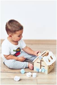 Деревянный домик сортер Mamabrum - это игрушка, которая не только радует малыша, но и служит его развитию. Рекомендуется педиатрами и педагогами. Это игрушка, которую нужно подарить каждому в детском и дошкольном возрасте.В набор входят восемь деревянных блоков, которые ребенок должен подогнать под отверстия в домике. На боковой стене также есть небольшая сенсорная доска, на которой ребенок может тренировать зрительно-моторную координацию.