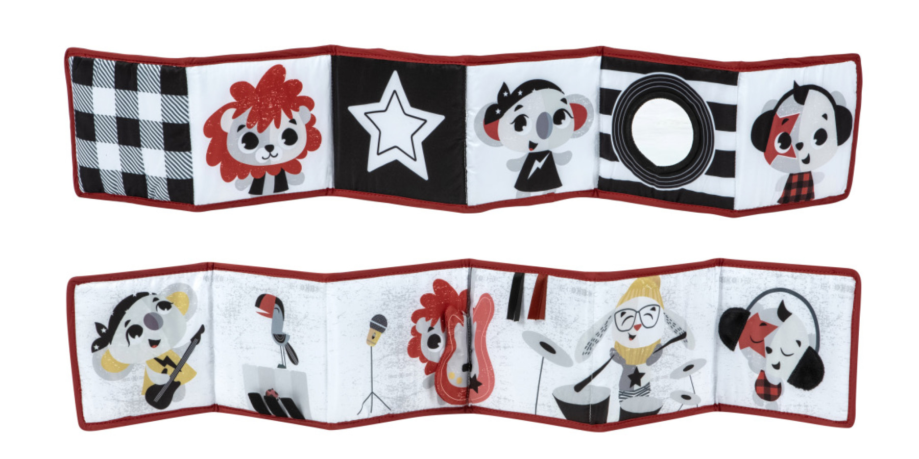 Развивающая двусторонняя книга Tiny Love Rock N Roll - двухсторонняя книга для детей с элементами активизации. С одной стороны книга черно-белая, с другой - цветная.