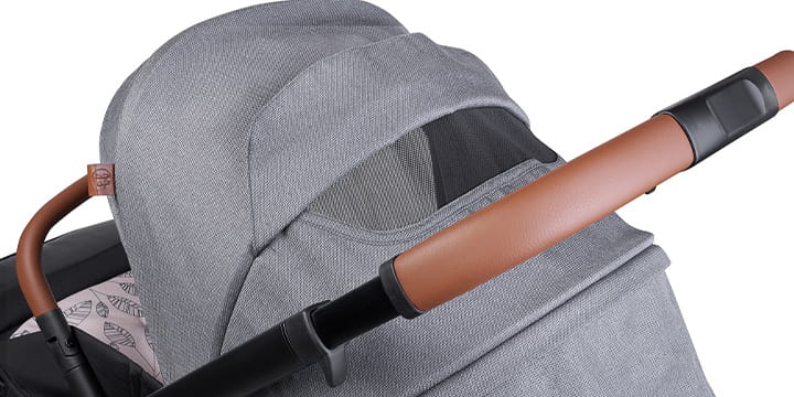 - Капюшон в коляске имеет удлинительную панель, поэтому даже когда спинка сложена в положение для сна, ваш ребенок имеет затененное место для сна.