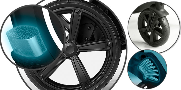- Все колеса коляски имеют амортизацию и не нуждаются в обслуживании, а это значит, что они не прокалываются. Это значит, что вы можете ездить по городу комфортно и заезжать на неасфальтированные дорожки.