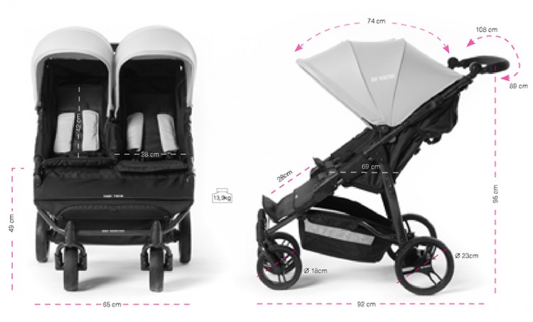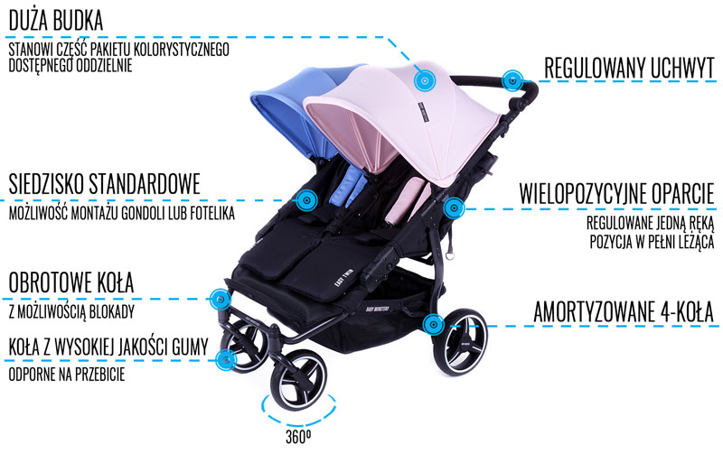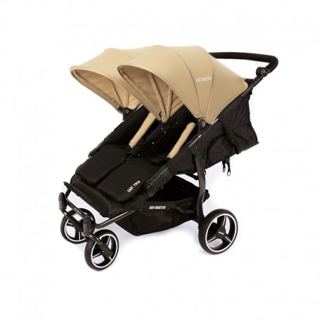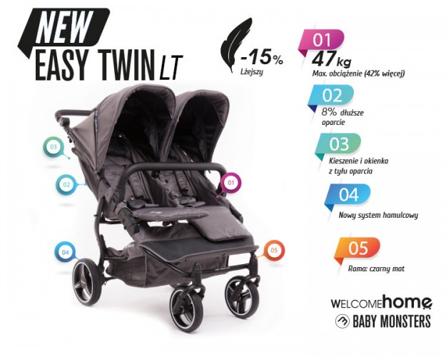 Прогулочная коляска для двойни Baby Monsters EASY TWIN 3.0S LT - чрезвычайно практичная коляска, предназначенная не только для двойни, но и для детей всех возрастов. Все благодаря дополнительным люлькам и адаптерам, делающим возможности конфигурации этой коляски почти безграничными. Ширина всего 65 см делает ее одной из самых узких колясок для двойни. Однако такие габариты не помешали дизайнерам обеспечить комфорт и функциональность поездки. Благодаря имеющимся адаптерам мы можем установить на раму коляски люльку или автокресло – благодаря этому коляска станет идеальным транспортным средством не только для двойни. Последняя версия BABY MONSTERS EASY TWIN 3.0S на 15% легче предшественницы, но выдерживает на 42% больше нагрузки. Увеличенная спинка и новая тормозная система делают путешествие еще более комфортным. Все это при ширине 65 см, что позволяет легко преодолевать узкие проходы и дверные проемы, и очень удобно. Easy Twin 3.0s – коляска, которая прослужит вам годами.