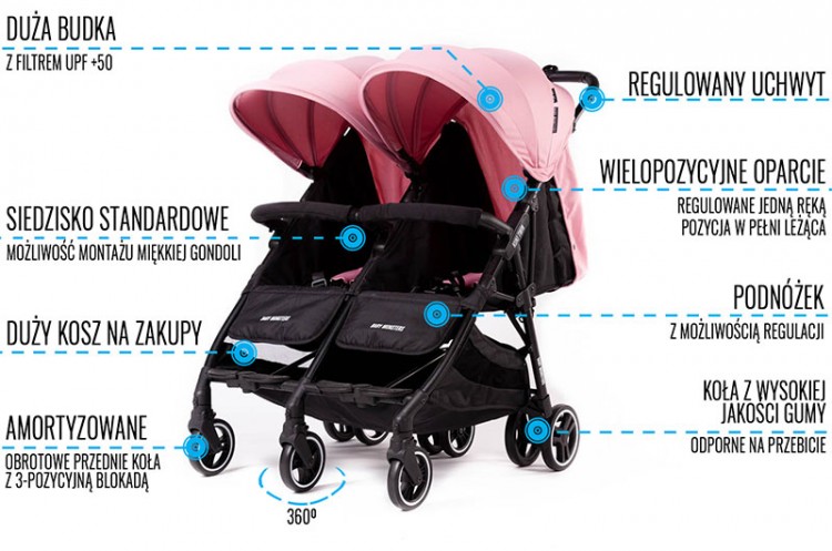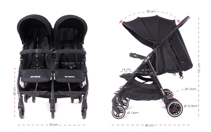 Коляска для двойни Baby Monsters Kuki Twin была разработана, чтобы соединить две очень важные характеристики современной коляски. Коляска проста в транспортировке и хранении – в сложенном виде она занимает меньше места, чем обычная коляска для двойни – и при этом не теряет своей функциональности.