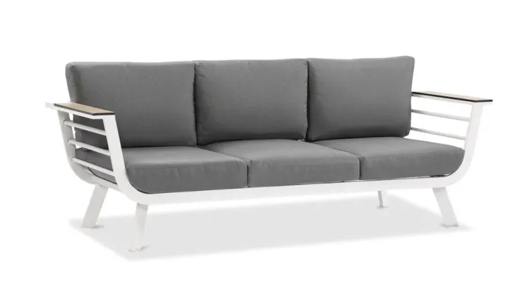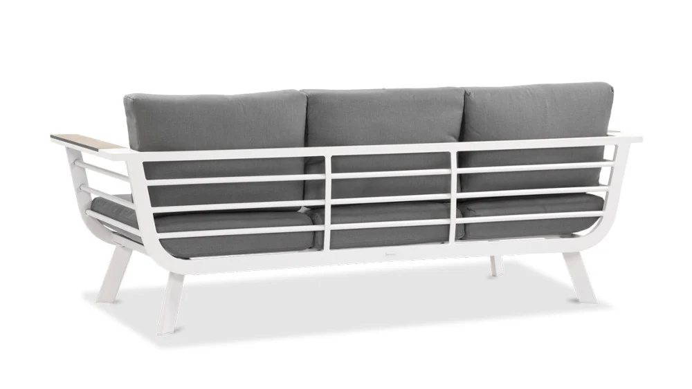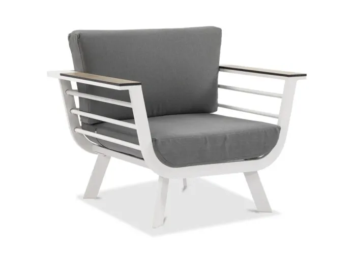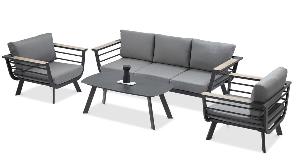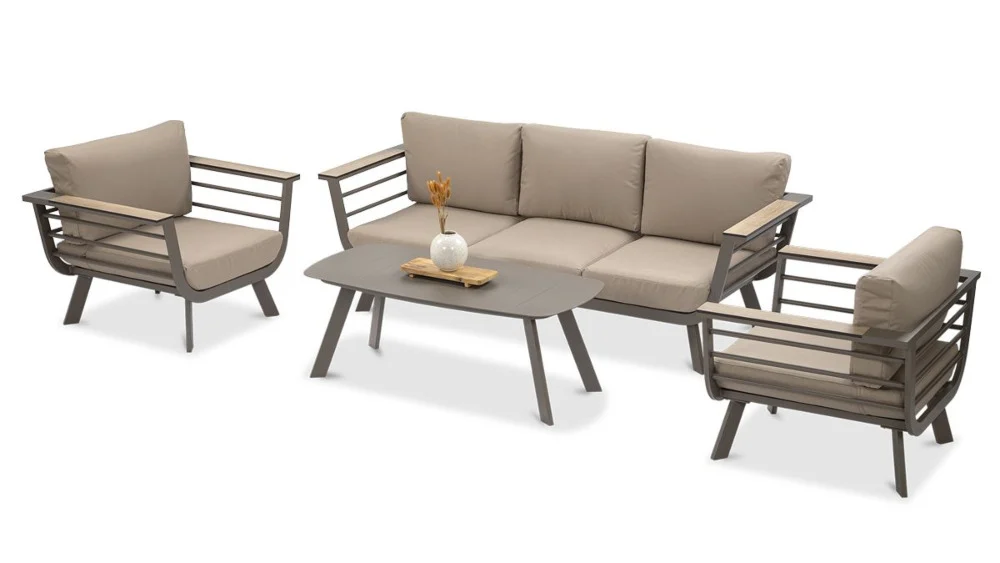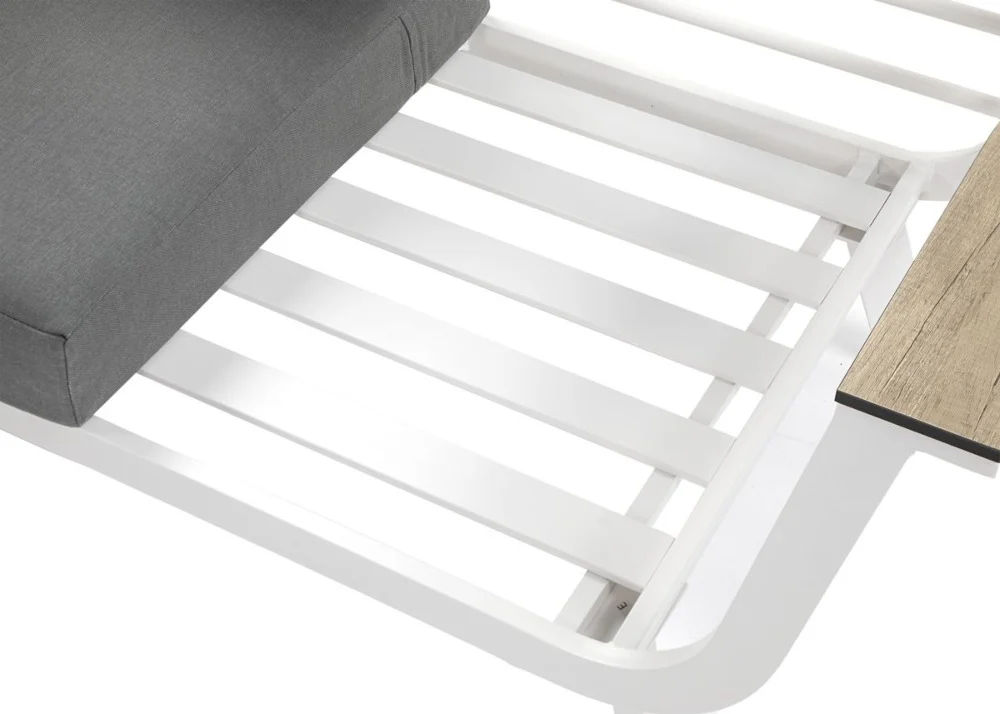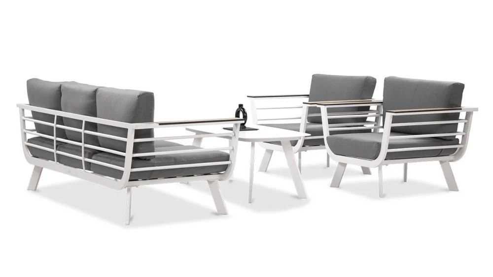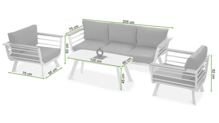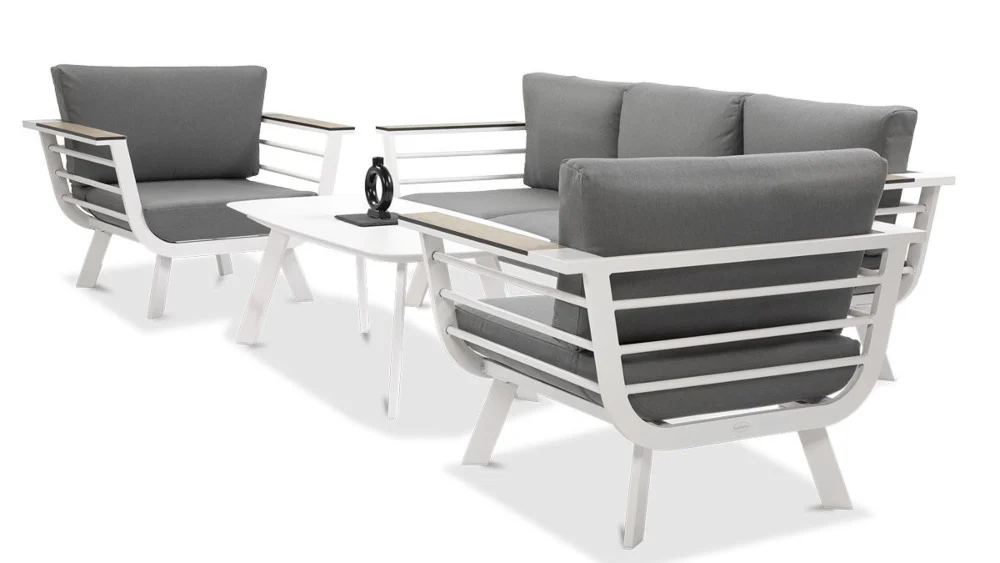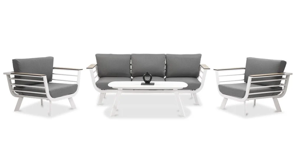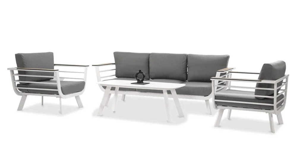 Внесите стиль и элегантность в свой сад! Выберите эстетически привлекательный и функциональный набор Aspen Caffe. Обеспечьте себя комфортным местом для времяпрепровождения с близкими. Комплект Aspen Caffe – это сенсационное предложение для тех, кто хочет обустроить свое приусадебное пространство стильно и практично. Мебель также пригодится как оборудование для рекреационных центров: садов ресторанов и гостиниц. Набор для отдыха Aspen Caffe для стильных садов. Aspen Caffe – это набор из 4 элементов, обеспечивающий оптимальное пространство для отдыха для 5 человек. В комплект входят 3-х местный диван, 2 кресла и журнальный столик, на котором можно поставить напитки, расставить тарелки с закусками или вкусно поесть блюда, приготовленные на гриле. Мебель выдержана в одной цветовой гамме, чтобы создать гармоничное целое. Каркасы набора и журнального столика изготовлены из алюминия, выкрашенного в белый цвет. Использование этого материала делает мебель очень легкой, и ее можно без труда передвигать или транспортировать. Диван и кресла гарантируют высокий уровень комфорта. Они оснащены подушками из пряденного полиэстера со съемными чехлами, которые можно стирать. Это материал, устойчивый к неблагоприятным погодным условиям. Мебель может находиться под дождем, порывистым ветром или интенсивным солнечным светом. Благодаря крепкой конструкции они хорошо справляются со сложными обстоятельствами. Они также не боятся интенсивного использования. Комплект выглядит очень стильно. Рамы и журнальный столик белые, а серые подушки. Сочетание этих двух цветов выглядит стильно и вне времени. Обратите внимание на детали. На подлокотниках мебели использованы столешницы из HPL. Эти вставки, имитирующие натуральное дерево, придают комплекту элегантности. Aspen Caffe – это комплект, который прекрасно дополнит современные, скандинавские, лофт-пространства, а также многие другие стили на открытом воздухе: балкон, терраса и сад.