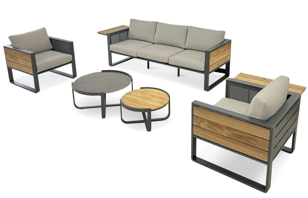 Набор для внутреннего дворика Furrore CARDENA CAFFE Grey – идеальный выбор для тех, кто ищет современный и элегантный комплект мебели для сада или террасы. Изготовлены из высококачественных материалов, таких как крепкая древесина тыка и толстый алюминий графитового цвета, устойчивый к ржавчине, мебель гарантирует долговечность и устойчивость к погодным условиям и ультрафиолетовому излучению. Кроме того, они легко чистятся. Набор состоит из трех удобных предметов мебели: большого 3-х местного дивана, двух удобных кресел и двух элегантных журнальных столиков. Диван и кресла снабжены подушками для дополнительного комфорта. Мебель прочная и долговечная, благодаря чему будет радовать своим безупречным внешним видом на протяжении многих лет. Приглушенная цветовая гамма комплекта Furrore CARDENA CAFFE Grey идеально сочетается с обустройством террасы, оранжереи или сада, добавляя современности и стиля. Этот комплект мебели для террасы отличается не только высоким качеством и функциональностью, но и современным дизайном. Возможность различных аранжировок и аксессуаров, таких как коврик, подушки или цветы, позволяет настроить его в соответствии с вашими предпочтениями. Мебель CARDENA CAFFE Grey от Furrore является идеальным дополнением к зоне отдыха, особенно для тех, кто ценит время, проведенное на свежем воздухе. Долговечность и прочность гарантируют длительный комфорт, придавая террасе эстетичности и элегантности.