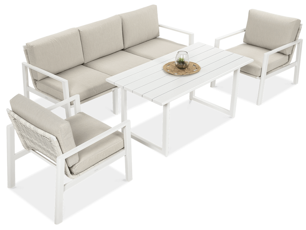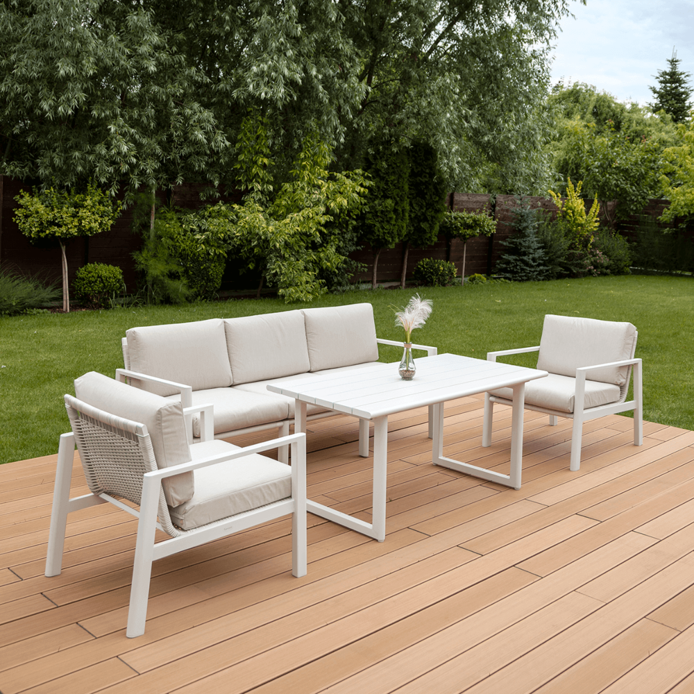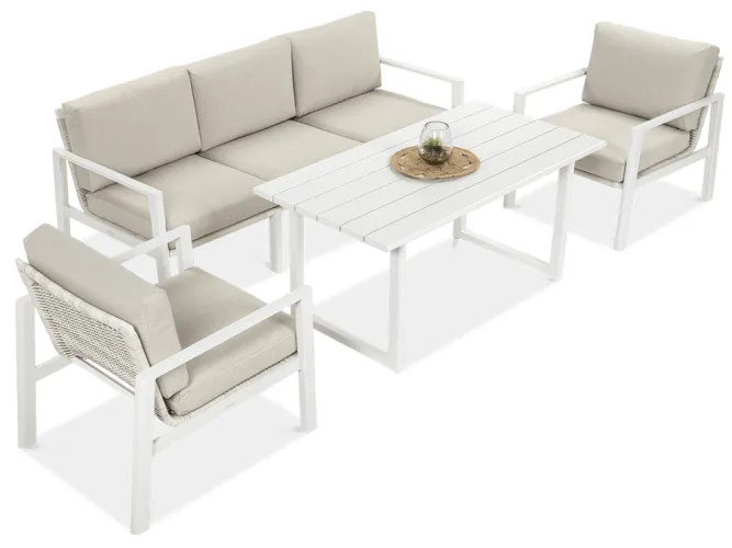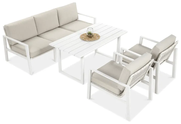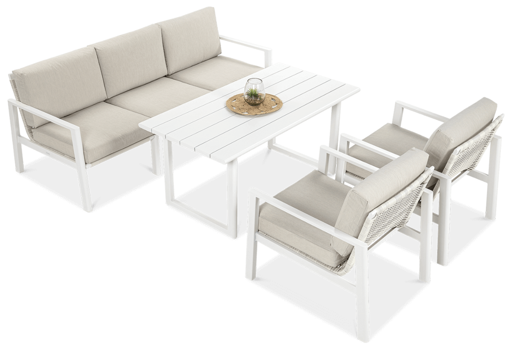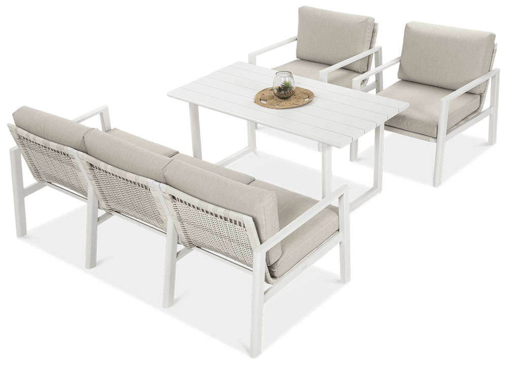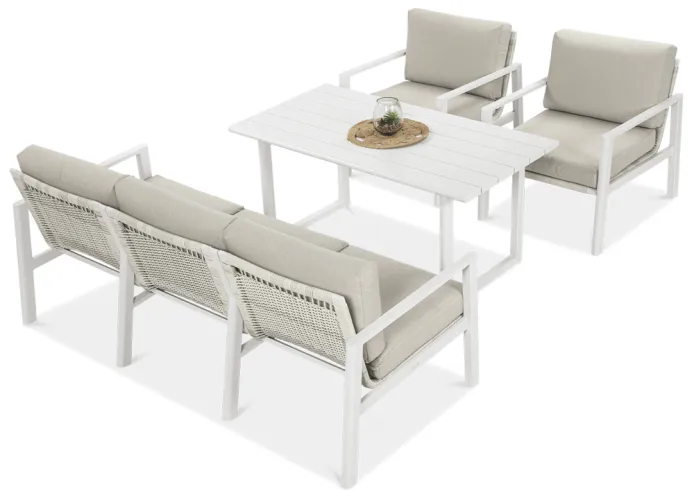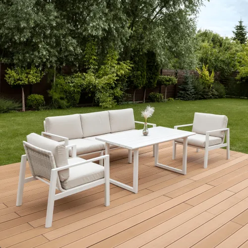 Furrore LOTUS DINNIG - это эксклюзивный и необыкновенно стильный обеденный набор, рассчитанный на 5 персон. Он включает в себя впечатляющий стол длиной 140 см, 3-х местный диван и 2 удобных кресла с мягкими подушками на сиденьях и спинках. Набор не только впечатляет, но и очень удобен. Изысканный и оригинальный характер мебели подчеркивает современный цвет оттенка приглушенного белого. Конструкция мебели изготовлена из легкого и крепкого крашеного алюминия. Стильным дополнением является техноротанг, которым обиты спинки и сиденья кресел, что подчеркивает светлый дизайн. Мебель выглядит очень эффектно благодаря сочетанию светлого алюминия и бежевой ткани на чехлах подушек. Комплект LOTUS DINING отличается высокой прочностью, устойчивостью к погодным условиям и ультрафиолетовому излучению. Его легко поддерживать в чистоте – алюминий легко моется водой, а чехлы подушек можно снять и постирать в стиральной машине. Комплект идеально впишется в современный дизайн террасы, зимнего сада или зимнего сада. Это идеальное дополнение к гостиной и столовой, особенно если вы любите проводить время на свежем воздухе, обедать на свежем воздухе или организовывать вечеринки в саду. Высокая долговечность и прочность делают мебель настоящим украшением сада. Вы можете свободно модифицировать набор в соответствии со своими потребностями – использовать диван отдельно или обустроить зону с креслами и небольшим журнальным столиком для послеобеденного отдыха. Легкость мебели позволяет легко расставлять ее в соответствии с текущими потребностями. Приглушенная цветовая гамма позволяет создавать разнообразные композиции как в светлом, спокойном стиле, так и более яркие, добавляя контрастные цвета в виде коврика, подушек или посуды. Мебель для гостиной Furrore LOTUS DINING White станет идеальным дополнением к другой мебели серии LOTUS, особенно если вы ищете комплексное обустройство современной террасы в оригинальном стиле.