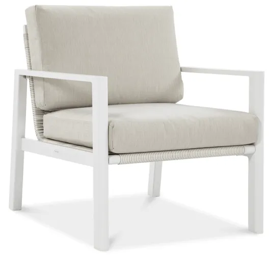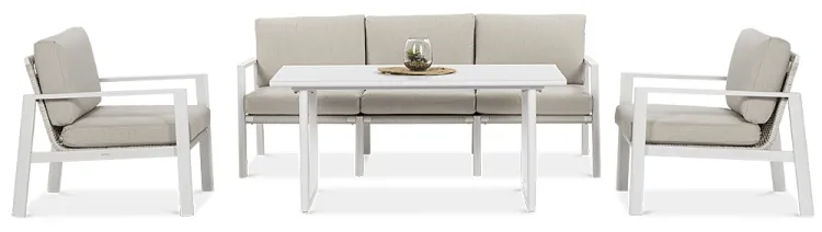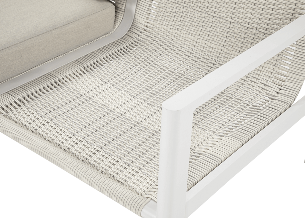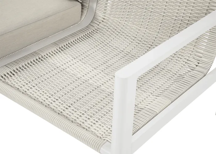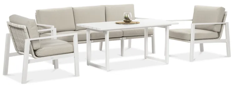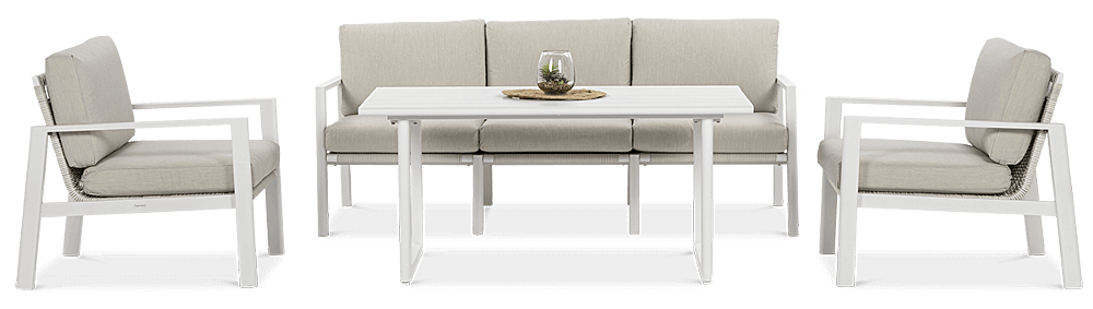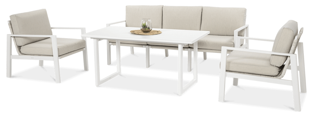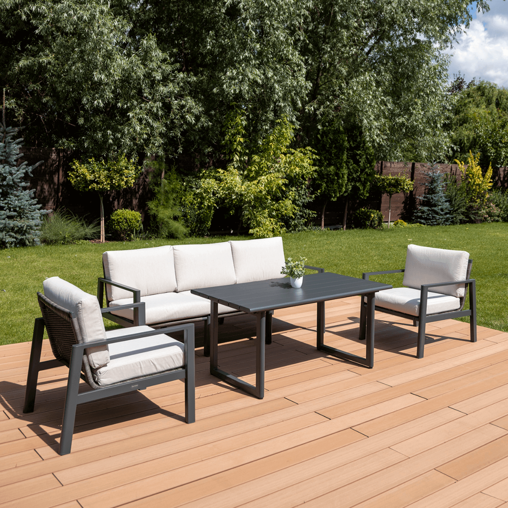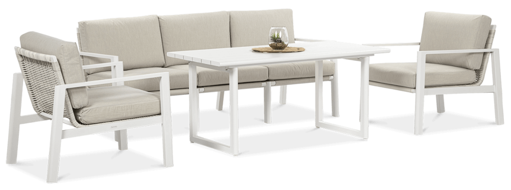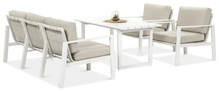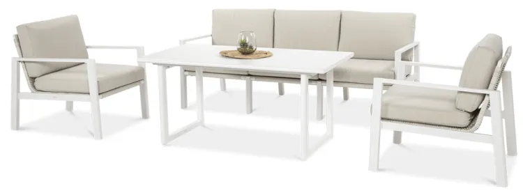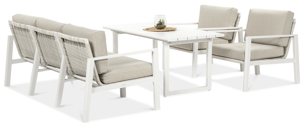 Furrore LOTUS DINNIG - это эксклюзивный и необыкновенно стильный обеденный набор, рассчитанный на 5 персон. Он включает в себя впечатляющий стол длиной 140 см, 3-х местный диван и 2 удобных кресла с мягкими подушками на сиденьях и спинках. Набор не только впечатляет, но и очень удобен. Изысканный и оригинальный характер мебели подчеркивает современный цвет оттенка приглушенного белого. Конструкция мебели изготовлена из легкого и крепкого крашеного алюминия. Стильным дополнением является техноротанг, которым обиты спинки и сиденья кресел, что подчеркивает светлый дизайн. Мебель выглядит очень эффектно благодаря сочетанию светлого алюминия и бежевой ткани на чехлах подушек. Комплект LOTUS DINING отличается высокой прочностью, устойчивостью к погодным условиям и ультрафиолетовому излучению. Его легко поддерживать в чистоте – алюминий легко моется водой, а чехлы подушек можно снять и постирать в стиральной машине. Комплект идеально впишется в современный дизайн террасы, зимнего сада или зимнего сада. Это идеальное дополнение к гостиной и столовой, особенно если вы любите проводить время на свежем воздухе, обедать на свежем воздухе или организовывать вечеринки в саду. Высокая долговечность и прочность делают мебель настоящим украшением сада. Вы можете свободно модифицировать набор в соответствии со своими потребностями – использовать диван отдельно или обустроить зону с креслами и небольшим журнальным столиком для послеобеденного отдыха. Легкость мебели позволяет легко расставлять ее в соответствии с текущими потребностями. Приглушенная цветовая гамма позволяет создавать разнообразные композиции как в светлом, спокойном стиле, так и более яркие, добавляя контрастные цвета в виде коврика, подушек или посуды. Мебель для гостиной Furrore LOTUS DINING White станет идеальным дополнением к другой мебели серии LOTUS, особенно если вы ищете комплексное обустройство современной террасы в оригинальном стиле.