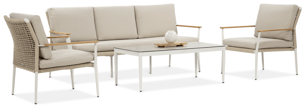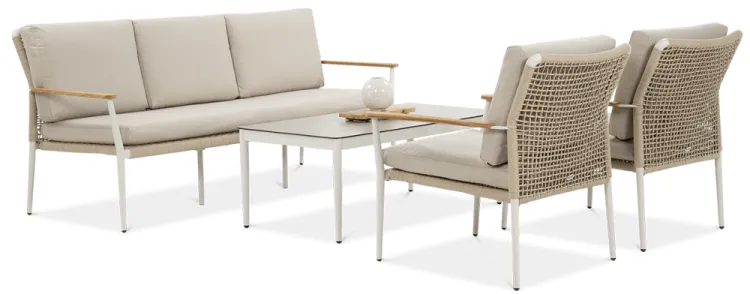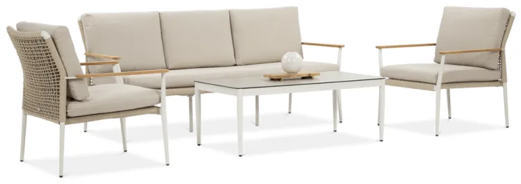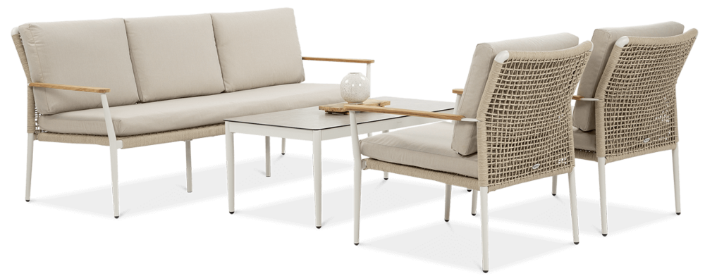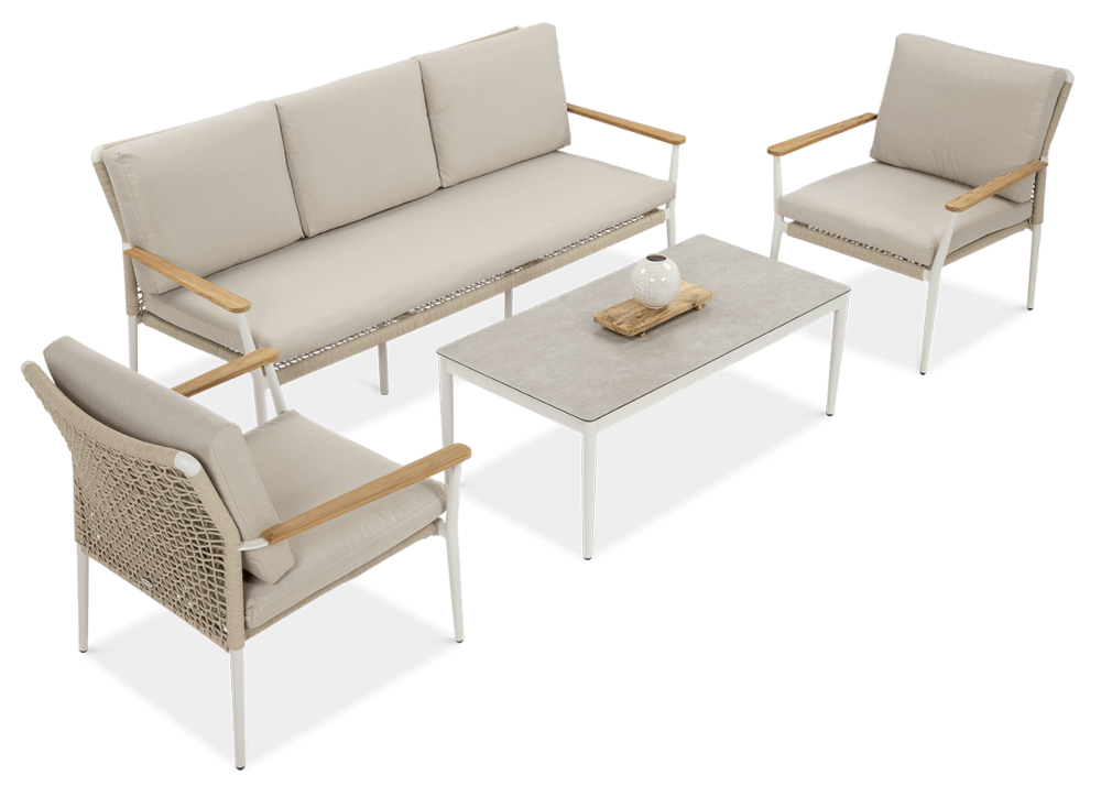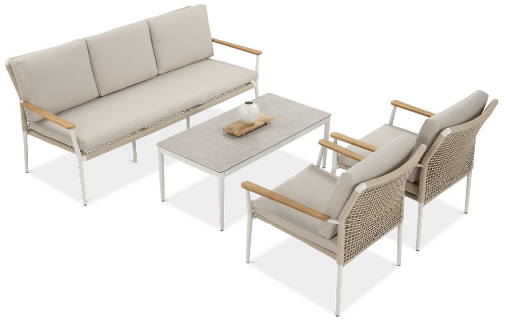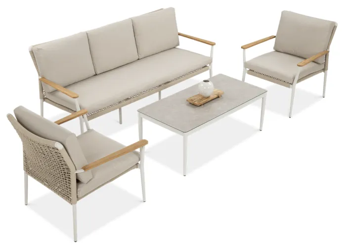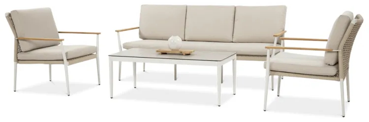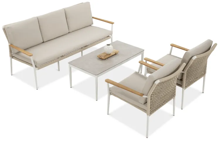 Комплект мебели для отдыха Furrore LUNA CAFFE – идеальное решение для людей, которые ищут качественный и роскошный отдых. Каждый элемент набора тщательно разработан, чтобы создать неповторимую атмосферу и обеспечить максимальный комфорт. В комплект входит 3-местный диван размером 196,5 х 82 х(В)85 см и два кресла размером 76,5 х 82 х(В) 85 см. В набор также входит стол размером 120 х 60 х(В) 45 см. Конструкция мебели изготовлена из прочного алюминия, который был тщательно оплетен высококачественной веревкой, создавая уникальный вид. Подлокотники из тикового дерева придают элегантность и тепло, создавая гармоничную композицию с остальной мебелью. Столешница толщиной 5 см покрыта прочным керамическим стеклом, которое не только выглядит стильно, но также чрезвычайно практично и легко в уходе. Подушки сиденья имеют толщину 8 см, а спинки 12 см, что обеспечивает комфорт во время долгих часов отдыха. Наволочки изготовлены из высококачественного вспененного полиэстера, что придает мебели элегантный вид. Наволочки оснащены молниями, что облегчает их чистку и уход. Подушки наполнены пеной и волокном, что обеспечивает необходимую поддержку и комфорт. Комплект мебели Furrore LUNA CAFFE Light Beige – идеальное сочетание функциональности, комфорта и элегантности. Бренд FURRORE обеспечивает уникальный вид и уникальный опыт отдыха в вашем саду.