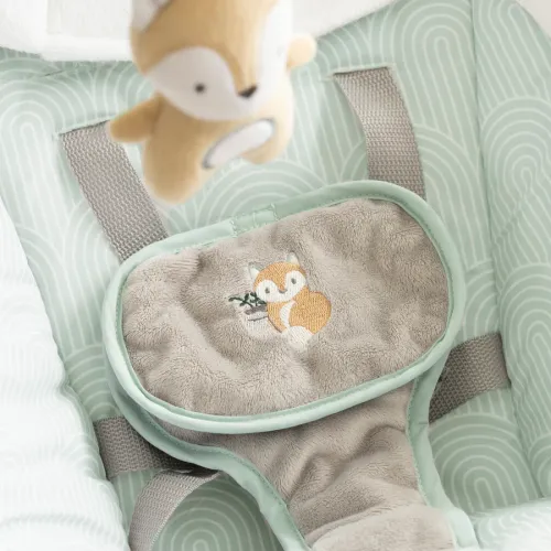 - 2 режима использования: качели легко фиксируются на месте, чтобы стать неподвижным сиденьем; 2 положения лежа в неподвижном режиме; Успокаивающие вибрации помогают успокоить ребенка в режиме сидения и качелей; Съемная поворотная панель игрушек с 1 плюшевой игрушкой лисенка помогает развлечься