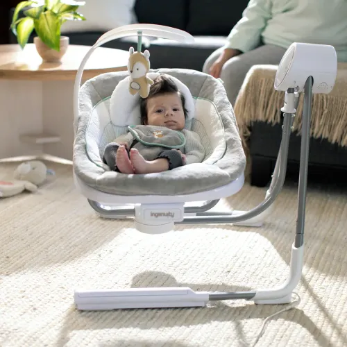 - Переносные качели Ingenuity AnyWay Sway вращаются на 180° и двигаются в 3 направлениях, чтобы ребенку было удобно и хорошо видно; Гендерно-нейтральный принт сочетается с любым декором и станет отличным подарком.