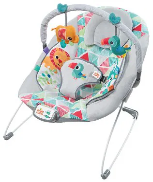 Шезлонг - качели BRIGHT STARTS Toucan Tango - поднимет настроение малышу в сохранности. Комфортная зона сиденья обеспечивает идеальный комфорт и поддержку благодаря успокаивающей вибрации, плюшевым тканям, встроенной вставке для новорожденных и съемному подголовнику. Красочные и привлекательные персонажи делают этот шезлонг веселым! Малышу понравятся успокаивающие ощущения красочных атласных лент.