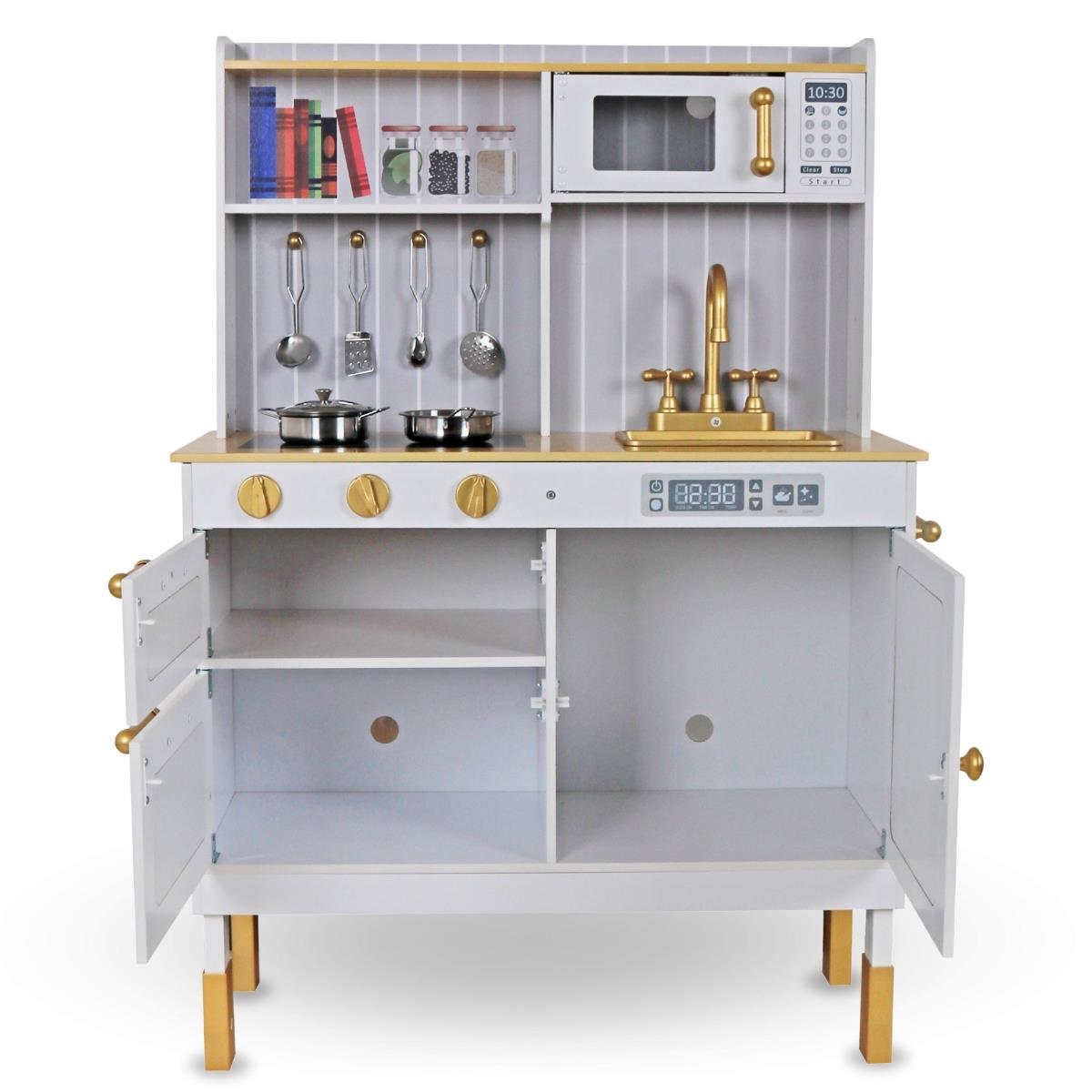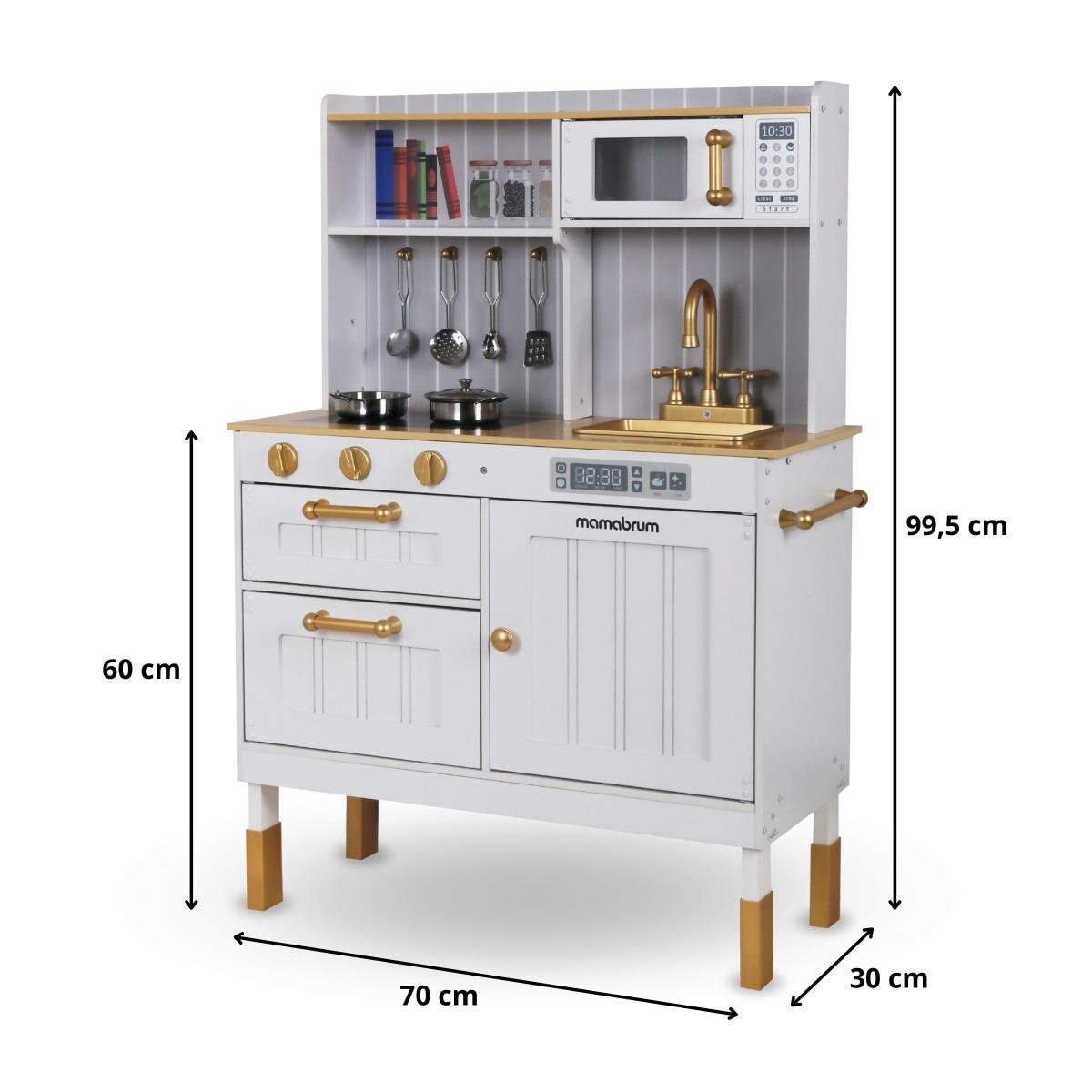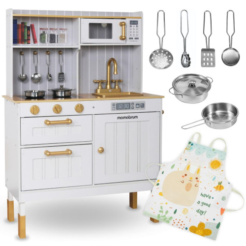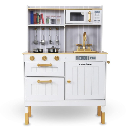 Деревянная кухня Mamabrum MAM170 – время вкусно поесть! Ваш малыш обязательно приготовит для вас что-нибудь особенное! Оснащенная многочисленными аксессуарами, кухня – это мечта любого малыша, который интересуется кулинарией и не только! Ваш ребенок часто наблюдает за вами на кухне? Малыши любят подражать взрослым, поэтому игра в приготовление вкусных блюд непременно понравится им. Деревянная кухня развлекает разными способами. Ее современный дизайн со столешницей из натурального дерева и белыми шкафчиками эффективно привлекает детское внимание и делает кухню украшением детской комнаты.