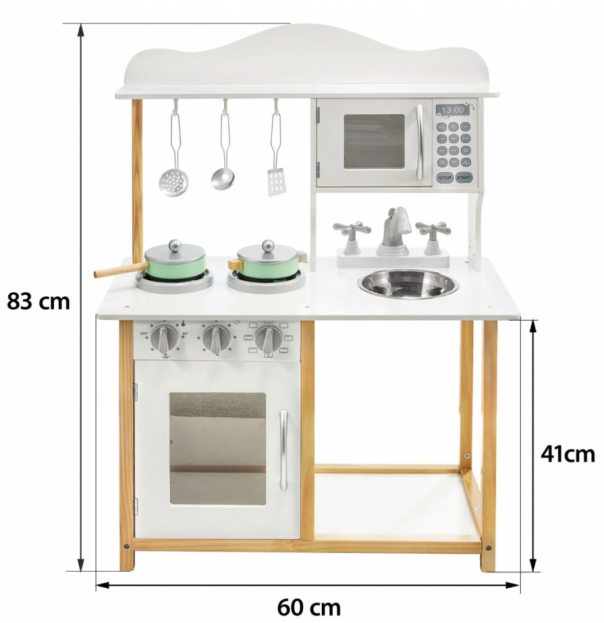 Деревянная кухня Mamabrum MINI-MAXI + аксессуары -Хотите чтобы ваш ребенок был самостоятельная, для этого нужно приучать с детства к взрослым задач, например чтобы помогать вам делать есть для этого вам пригодится невероятная красивая и реалистичная кухняMamabrum MINI-MAXI .Бытовая техника, такая как духовка, плита и микроволновая печь, очень похожа на настоящую, поэтому дети могут полностью взять на себя роль взрослых. Кроме того, набор пополнился кухонной утварью: ложками и лопатками, кастрюлями и красивым кухонным фартуком. Над варочной панелью есть крючки, на которые можно повесить посуду, а вся плита украшена со вкусом.