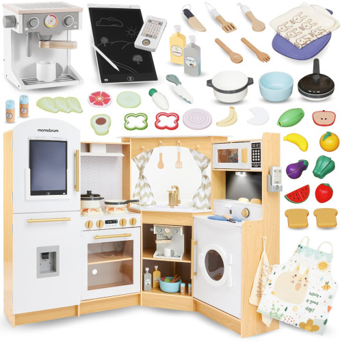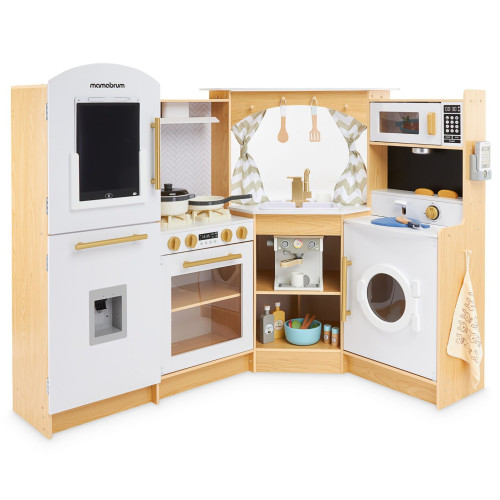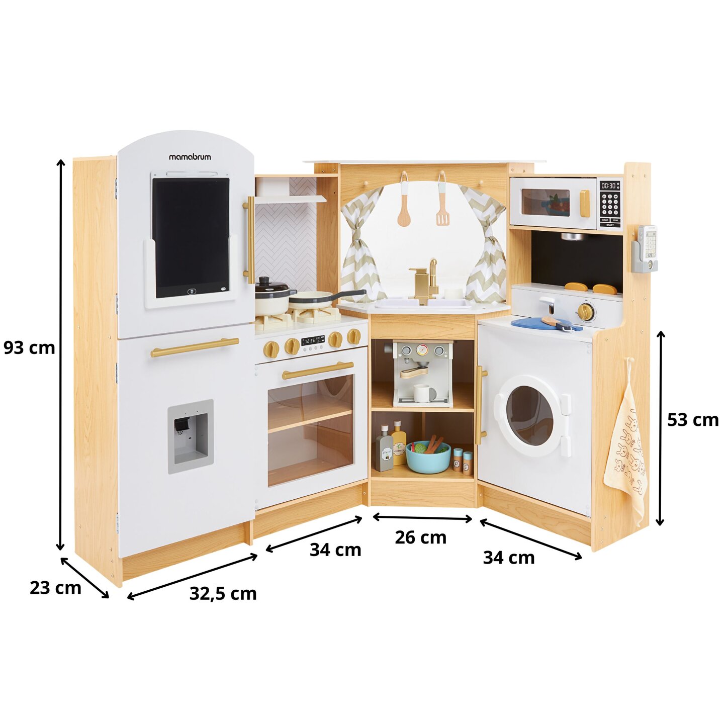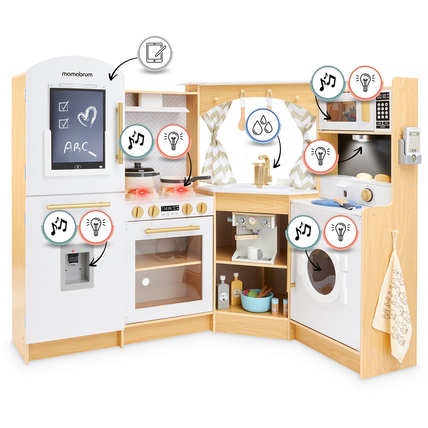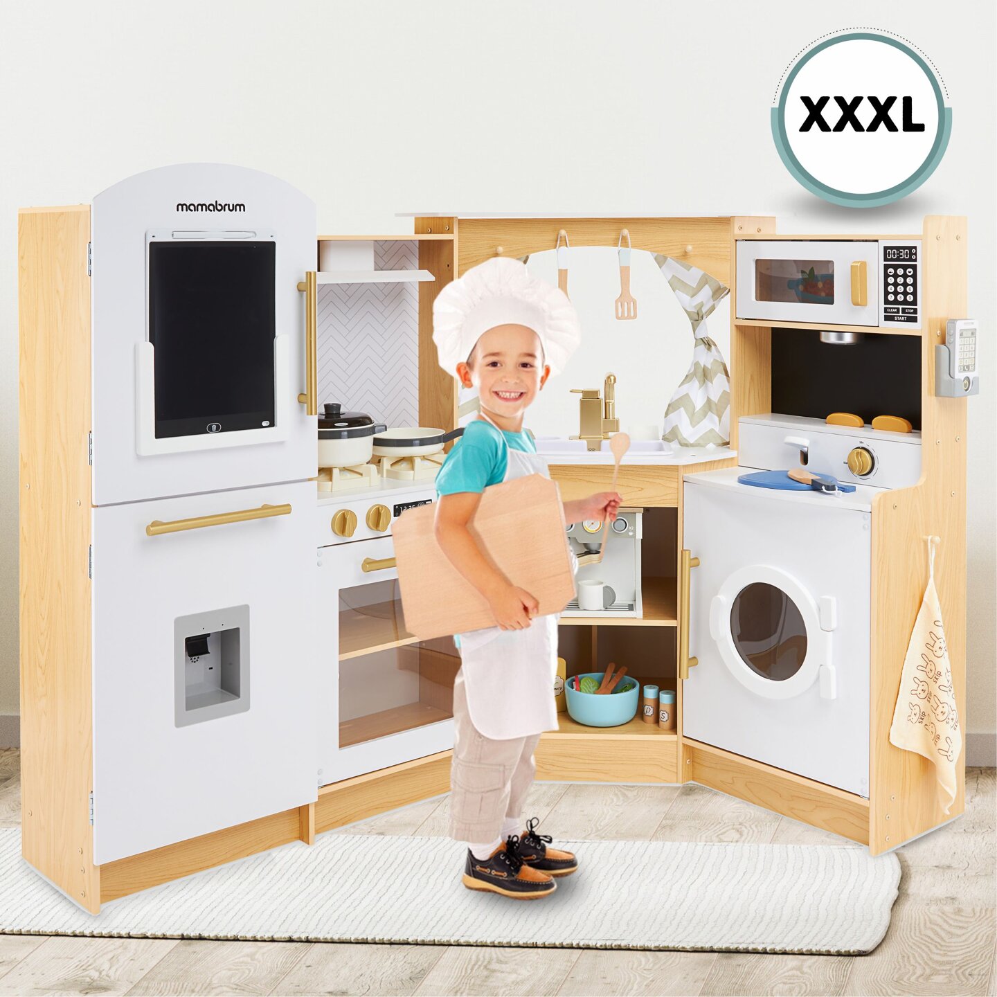 Деревянная кухня Mamabrum XXXXL MAM171 – это мечта каждого маленького кулинара, которая прекрасно подойдет на подарок! Хорошо оборудованная деревянная кухня гарантирует много часов творческого удовольствия! Большая кухня оборудована всем, что может понадобиться маленькому повару. Кроме электрической плиты и духовки, в нем также есть микроволновка, тостер, диспенсер для воды, стиральная машина и кран. Звуки и световые сигналы, которые издает кухня (питание от батареек), разнообразят развлечения ребенка. Бренд славится своей популярностью среди маленьких помощников, поэтому долговечность товара вам гарантирована. В игру приготовления пищи можно играть каждый раз по другому сценарию, поэтому вам не заскучать! Большая кухня из массива станет украшением детской комнаты. Он отличается минималистическим и естественным дизайном, благодаря чему идеально впишется в любую обстановку! Деревянная детская кухня с интерактивным краном – ХИТ среди маленьких поваров! Кран, из которого течет настоящая вода, когда вы открываете его, дарит детям большое удовольствие и позволяет реалистично играть. Ребята смогут использовать кран для мытья овощей перед приготовлением пищи или мытья рук после кулинарных экспериментов. Это идеальное сочетание веселья и обучения, которое развивает творческие способности и практические навыки вашего ребенка! Уникальная система циркуляции воды позволяет играть без необходимости постоянно добавлять воду и риск переливания. Вода циркулирует по замкнутому контуру, просто наполните раковину и наслаждайтесь нескончаемым удовольствием! Требуются 2 батарейки типа АА – не входят в комплект.