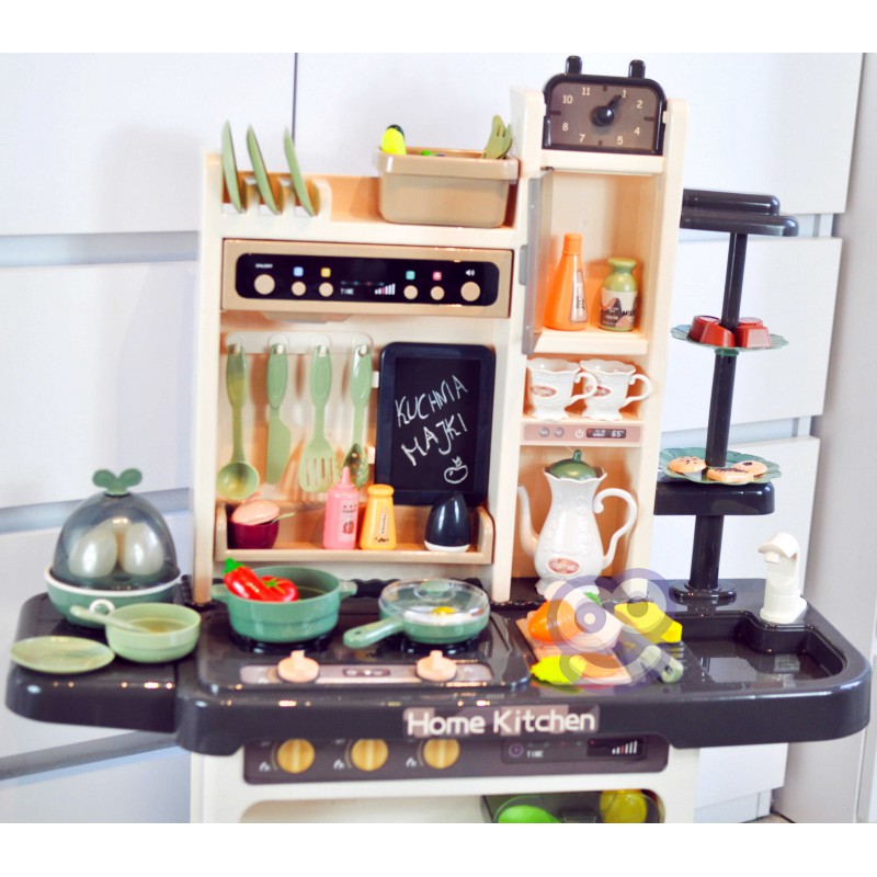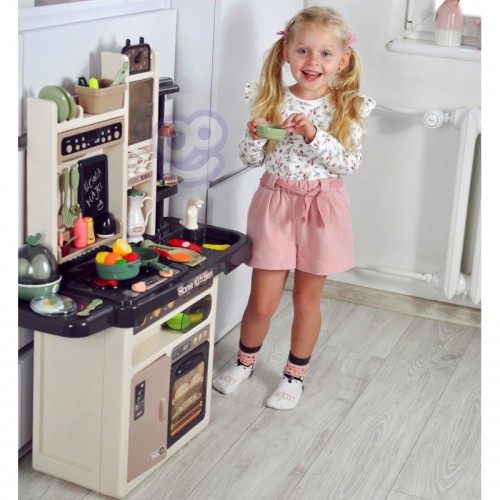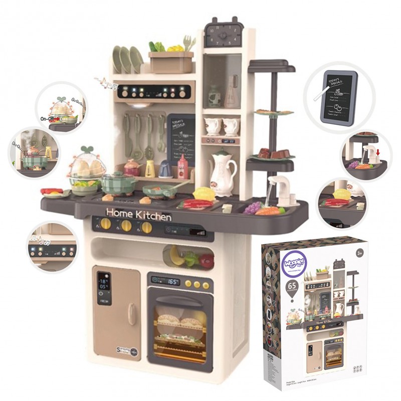 Детская кухня Woopie Home Kitchen + 65 аксессуаров – это все, что нужно юному кулинару. Благодаря удивительным эффектам ваш ребенок почувствует себя на настоящей кухне. Начните готовить, и когда вы свернете первую ручку, первая конфорка включится, лампочки начнут светиться, а из конфорки выйдет пар, имитирующий настоящую пару со звуком кипящей воды (пар не горячий, абсолютно безопасный). Домашняя кухня имеет вытяжку с подсветкой, которая выдает мелодии при нажатии кнопки включения/выключения, все это сопровождается светящимися световыми индикаторами. Вытяжка имеет многофункциональную кнопку с ноткой и двухступенчатый регулятор громкости. Кухня оборудована водопроводным краном (замкнутый контур, вода из крана подается при нажатии на помпу). Имеет яичницу, чтобы приготовить яйца, просто нажмите кнопку и загорится светодиодная лампочка, после чего из устройства раздастся звук приготовления (яйца будут крутиться, имитируя приготовление). Записывайте свое ежедневное меню на доске (мело и губка в комплекте).