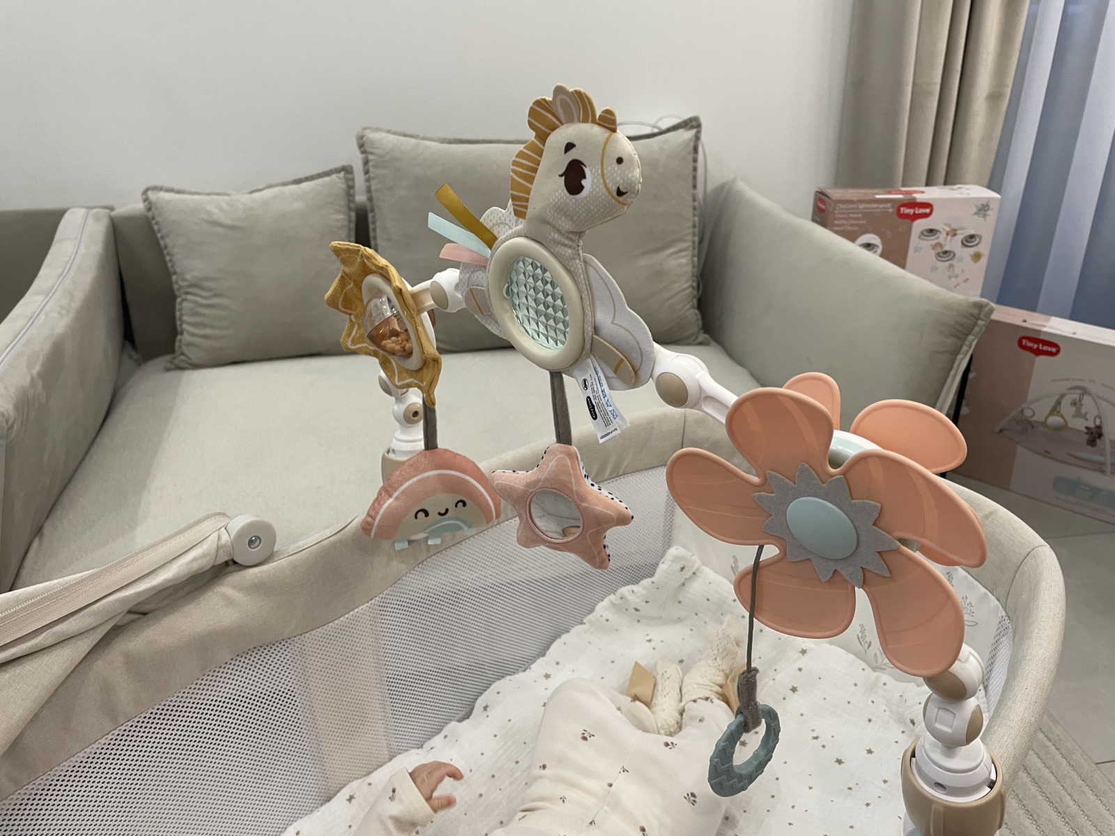 Дуга-трансформер Tiny Love Страна Единорога - это уникальное изделие, которое, прикрепленное к автокреслу, люльке или коляске, разнообразит время вашего малыша. Коллекция "Unicorn Land" - это волшебное путешествие в сказочный мир, которое превратит комнату вашего малыша в сказочную страну фантазий. Эта уникальная коллекция, украшенная волшебными мотивами единорогов и мерцающими звездами, была создана в сотрудничестве с экспертами по развитию детей, чтобы поддерживать их на каждом этапе роста. Благодаря нежной цветовой палитре и блестящим акцентам «Unicorn Land» создает атмосферу, полную невинности и радости, стимулируя воображение вашего ребенка и поощряя его открывать новые, увлекательные миры. Сияйте и открывайте! Игрушку очень легко собрать, а ее угол наклона можно регулировать в соответствии с потребностями каждого ребенка. Игрушки подвешенные на дуге позволят каждому ребенку развить большую моторику, точные движения и ощущения.