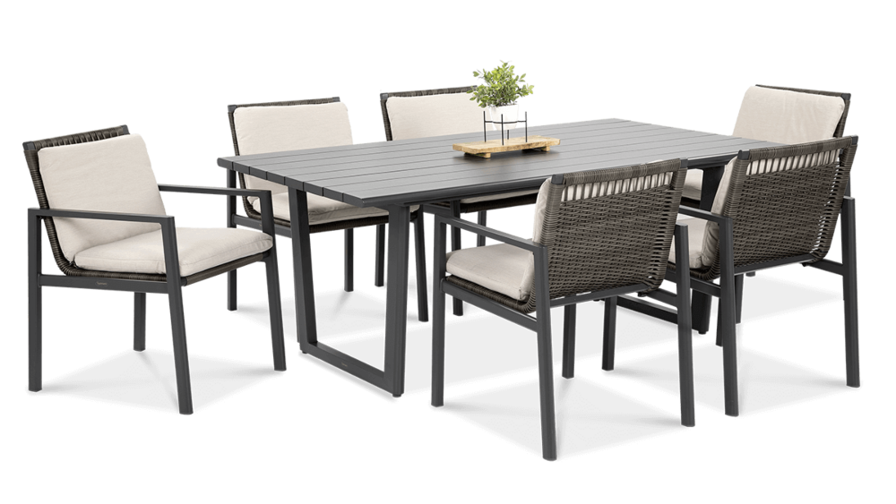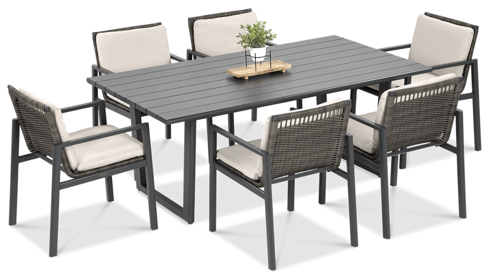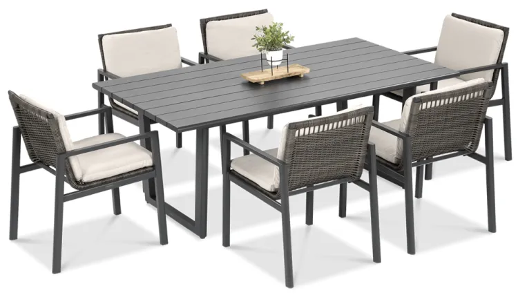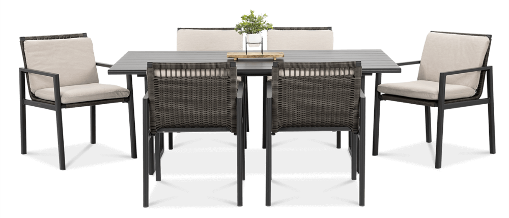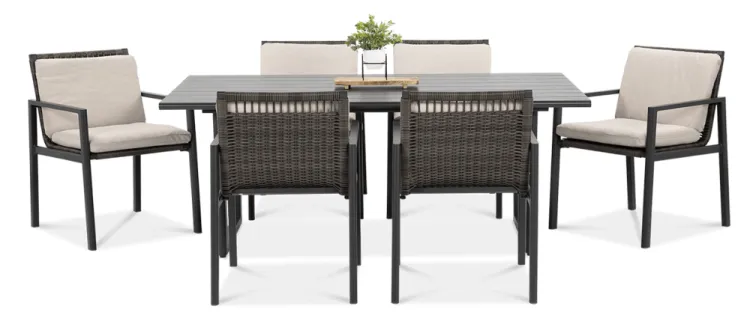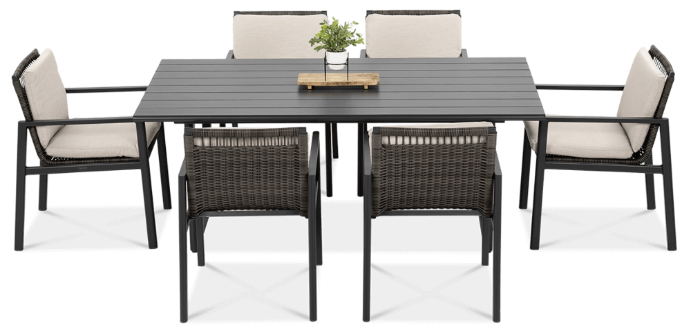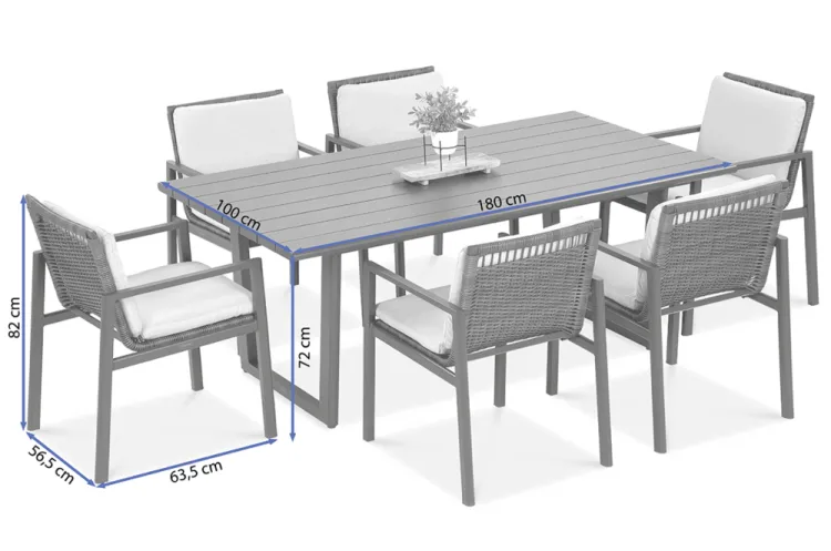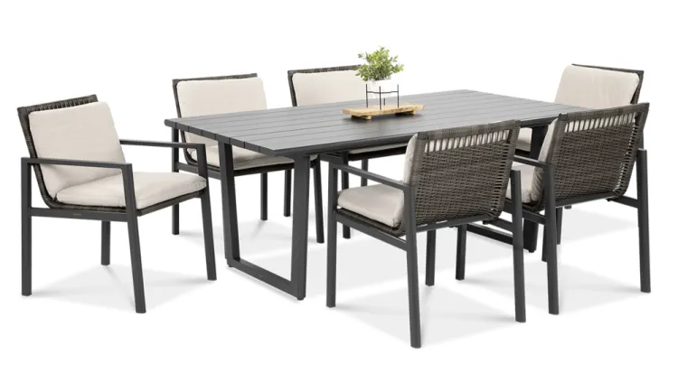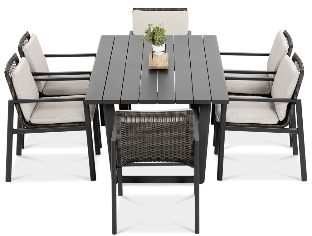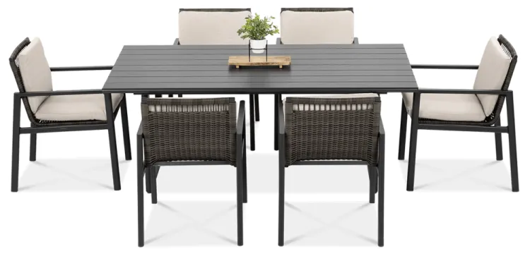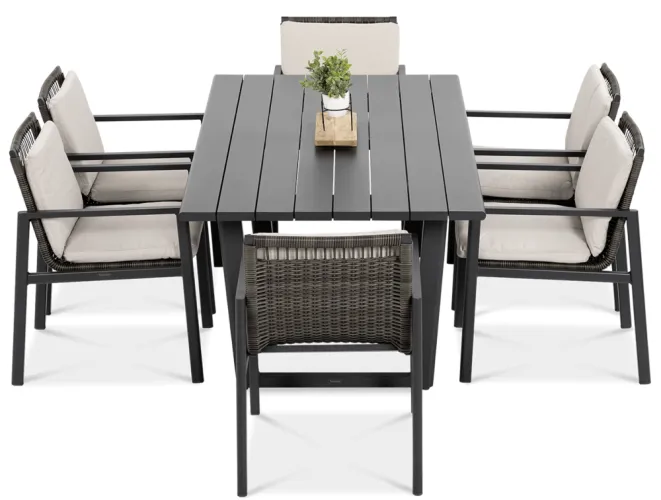 Обеденный набор Furrore LOTUS DINING 6+1 – это элегантный и очень стильный обеденный набор на 6 персон. В него входит привлекательный стол длиной 180 см и 6 удобных кресел с мягкими подушками на сиденьях и спинках. Набор смотрится чрезвычайно современно и очень удобен в использовании. Элегантный и оригинальный характер мебели подчеркивает ее современный цвет, то есть модный темно-серый. Конструкция изготовлена из легкого и очень прочного алюминия, который был точно окрашен высококачественной краской. Стиль подчеркивается техноротангом, использованным для отделки спинок и сидений кресел. Благодаря этому мебель приобретает роскошный и легкий дизайн. Интересный эффект создает сочетание темной мебели и светлого материала, использованного на наволочках. Мебель Furrore отличается высокой прочностью, устойчивостью к погодным условиям и УФ-излучением. Легко поддерживать в чистоте – мебель можно легко мыть водой, а наволочки можно снять и постирать в стиральной машине. Набор идеально впишется в современный декор террасы, оранжереи или сада. Это идеальное дополнение к гостиной и столовой, особенно если мы любим проводить время на свежем воздухе, есть под открытым небом или организовывать вечеринку в саду. Высокая долговечность и прочность делают мебель настоящим украшением сада. Легкость мебели позволяет легко передвигать и менять положение. Приглушенные цвета позволяют создать ряд композиций – в сером стиле или с добавлением других, контрастных цветов в виде ковра, подушек или столовой посуды. Обеденный набор Furrore LOTUS DINING 6+1 станет идеальным дополнением или дополнением к другой мебели из серии LOTUS, особенно если вы ищете комплексное обустройство современной террасы в оригинальном стиле.