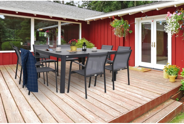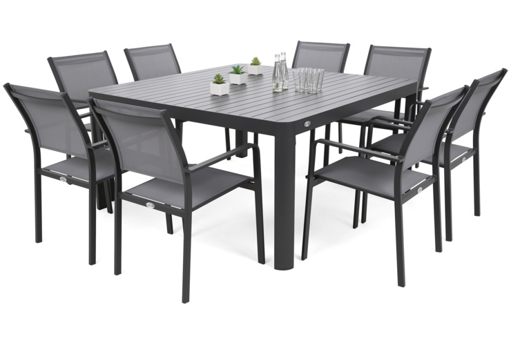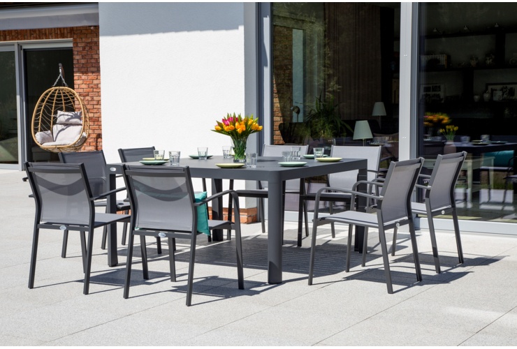 Садовая мебель на восемь человек, изготовленная из алюминия с порошковым покрытием, является очень классическим выбором, который идеально подойдет как в саду, так и на террасе. Практический садовый набор Catania Square удобен, функционален и долговечен. Использование материалов высочайшего качества гарантирует, что мебельный гарнитур переживет невредимым много летних сезонов. Каркасы стола и стула изготовлены из алюминия - материала, известного своей прочностью, но очень легкого. Сидения кресел покрыты тканью Texteline, которая проста в уходе и устойчива к повреждениям, а также не нагревается и делает сиденья чрезвычайно комфортными. Все это, как мы уже упоминали, было покрыто порошковой краской. Такой способ нанесения цвета позволяет получить гладкое и однородное покрытие, мало подверженное механическим повреждениям. В набор Catania Square входит стол, восемь стульев и монтажный комплект.